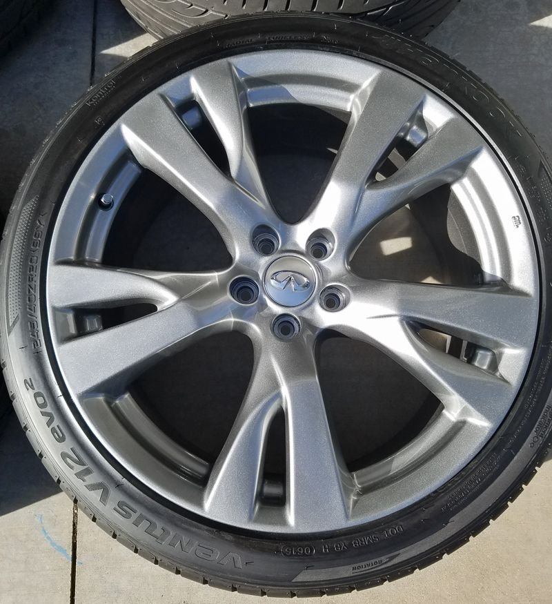 Q70 OEM 20" Split 5-Spoke Wheels with Hankook Tires. Excellent condition. Freshly painted. No curb rash. 20"x9.0" +43. 5x114.3 bolt pattern. 66.1 center bore. Hankook Ventus V12 Evo2 tires with only 1,200 miles on them. 245/40ZR20. 9/32nds tread remaining. Includes center caps. No TPMS.