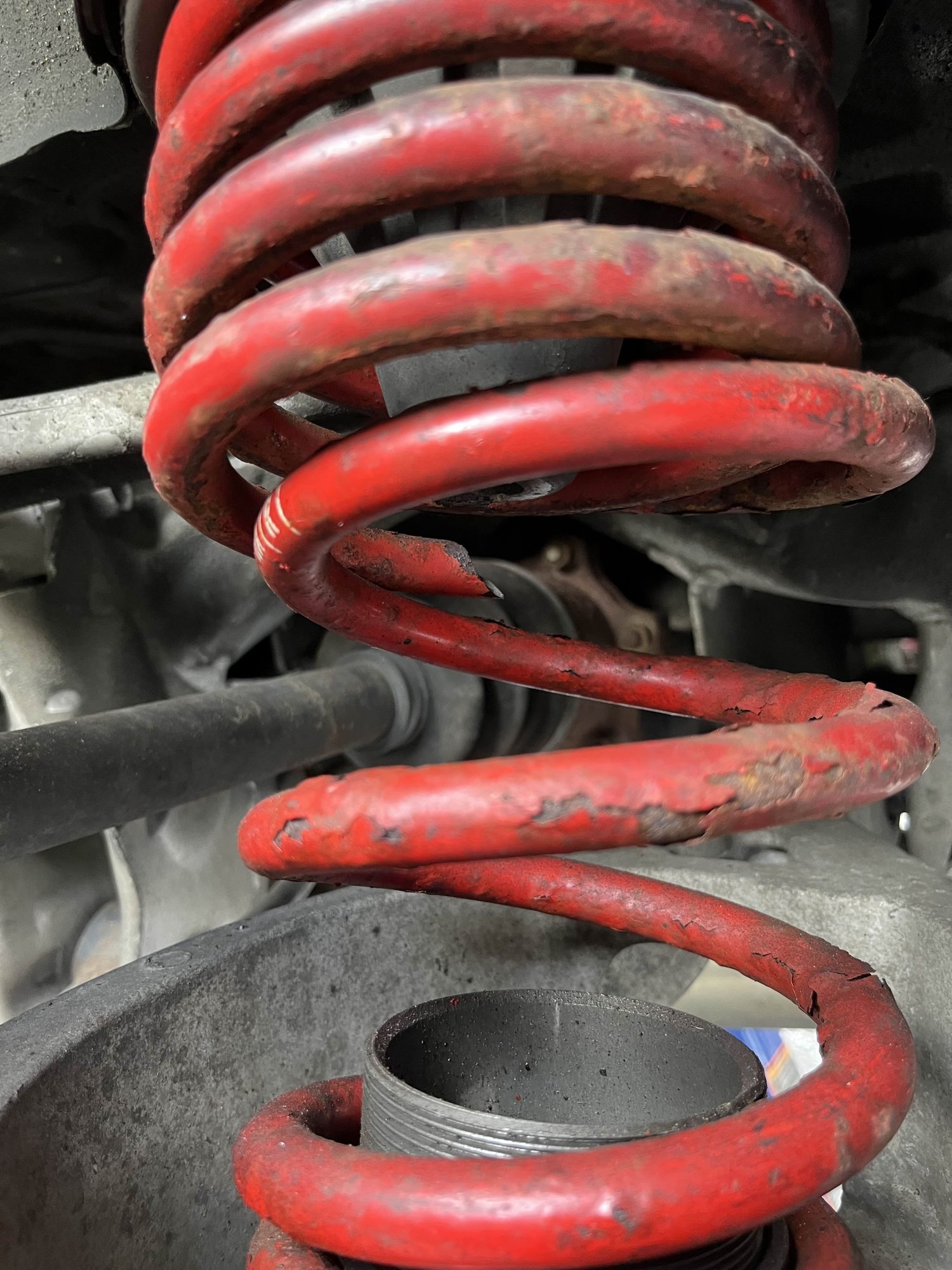 The other day I bought a set of H&R coilovers for a 350z from someone on fbm for a measly $200, a lot cheaper than their typical price. The seller was nice and the suspension was good, but one of my OE shocks wouldn't come off so I was left with one side with the new spring but the aftermarket shock (They weren't the original H&R shocks either, they were KYB Excel-G shocks), and one side with the new spring and the OE shock. When I took the car off jack stands, the front and rear were at completely different preloads and my car was effectively squatted. Me being lazy, didn't feel like fixing this until the day after (It was 2 am on a school night by the time I finished). The next day, the spring with the aftermarket shock broke in half right after the dead coils.