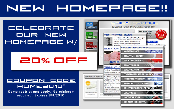 Save 20% OFF with the coupon code Home2010 through 8/8 EST with no minimum purchase (excludes packages, sale items and tools). We hope you find the new home page more functional and visually appealing. As always we are working hard to provide the highest quality website for online purchases and detailing resources. If you have any questions, suggestions or comments please feel free to let me know.