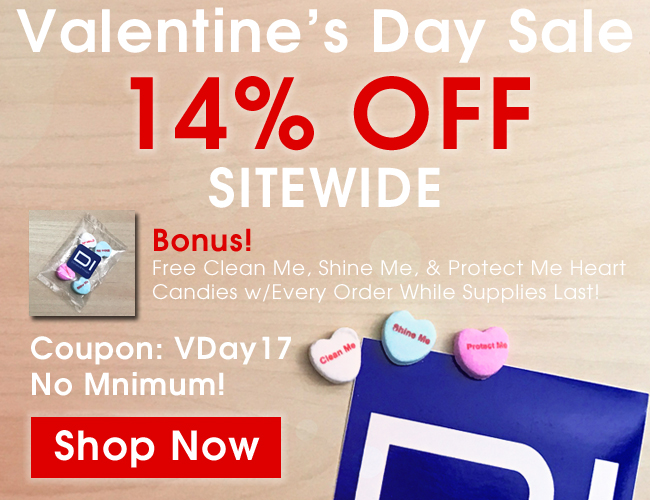 While supplies last get a free bonus DI Valentine's Day heart candy package with every order! The heart candies say Clean Me, Shine Me, and Protect Me.