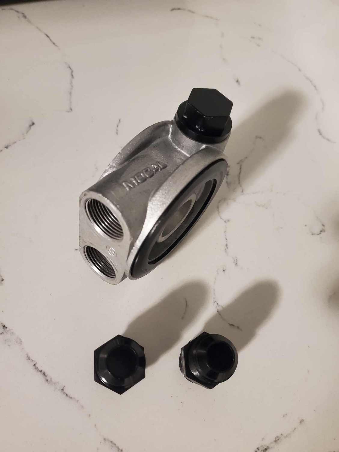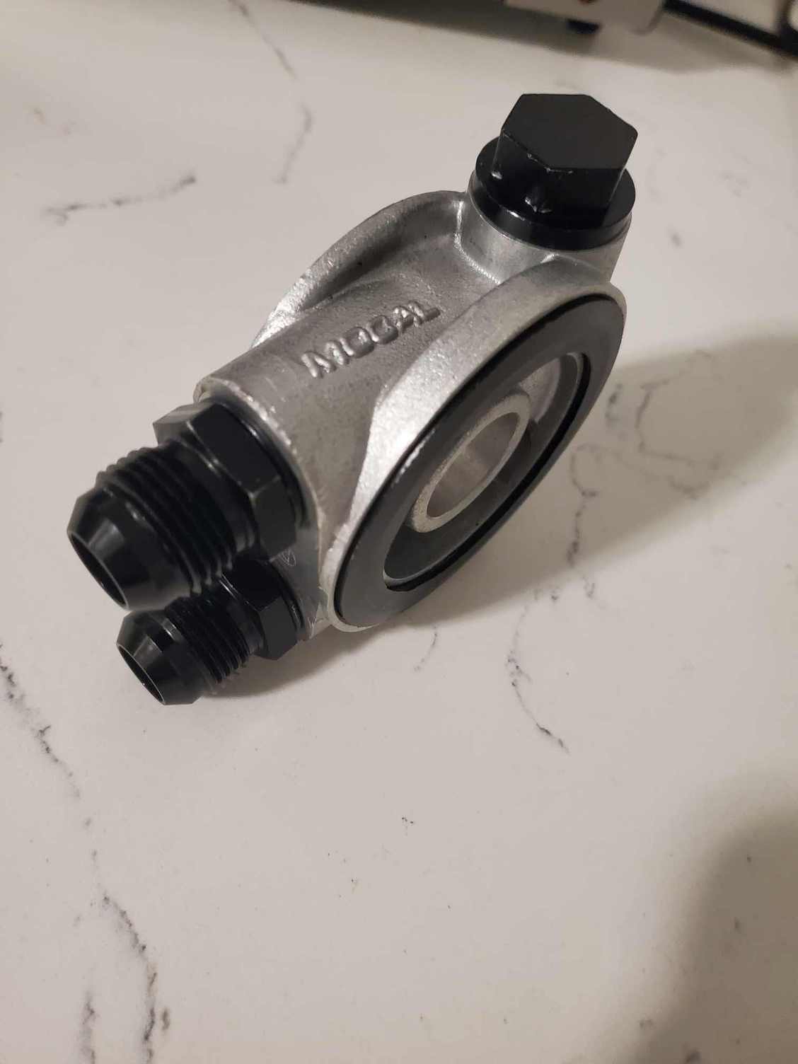 Mocal Oil Thermostat Sandwich Plate. This is a Mocal brand oil sandwich plate with a built in 180 degree thermostat. It goes between the block and oil filter, and directs oil to a cooler once the oil gets up to operating temperature. It includes two AN-10 adapter fittings.