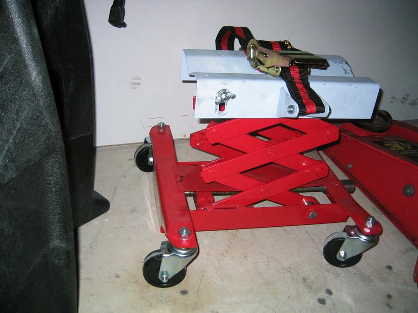 11. Once they are loose you can begin positioning the tranny jack, it was it a little tricky to actually tighten the band, its optional and it helps, just try your best. The center of gravity is towards the back of the transmission.