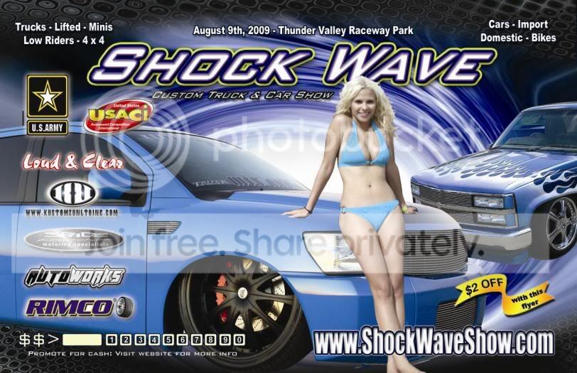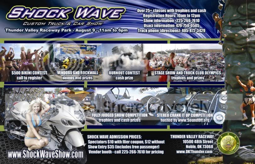 SHOCK WAVE custom truck and car show will be on Sunday, August 9th at Thunder Valley Raceway Park in Noble, OK. Registration is at the show from 10am to 12pm. Activities will include fully judged truck, car, and bike show, Usaci double points crank it up contest, burnout contest, ladies swimsuit competition, stage show with truck club “Olympics”, vendors and giveaways, food and beer concession on-site! For list of classes and event info, check out www.ShockWaveShow.com