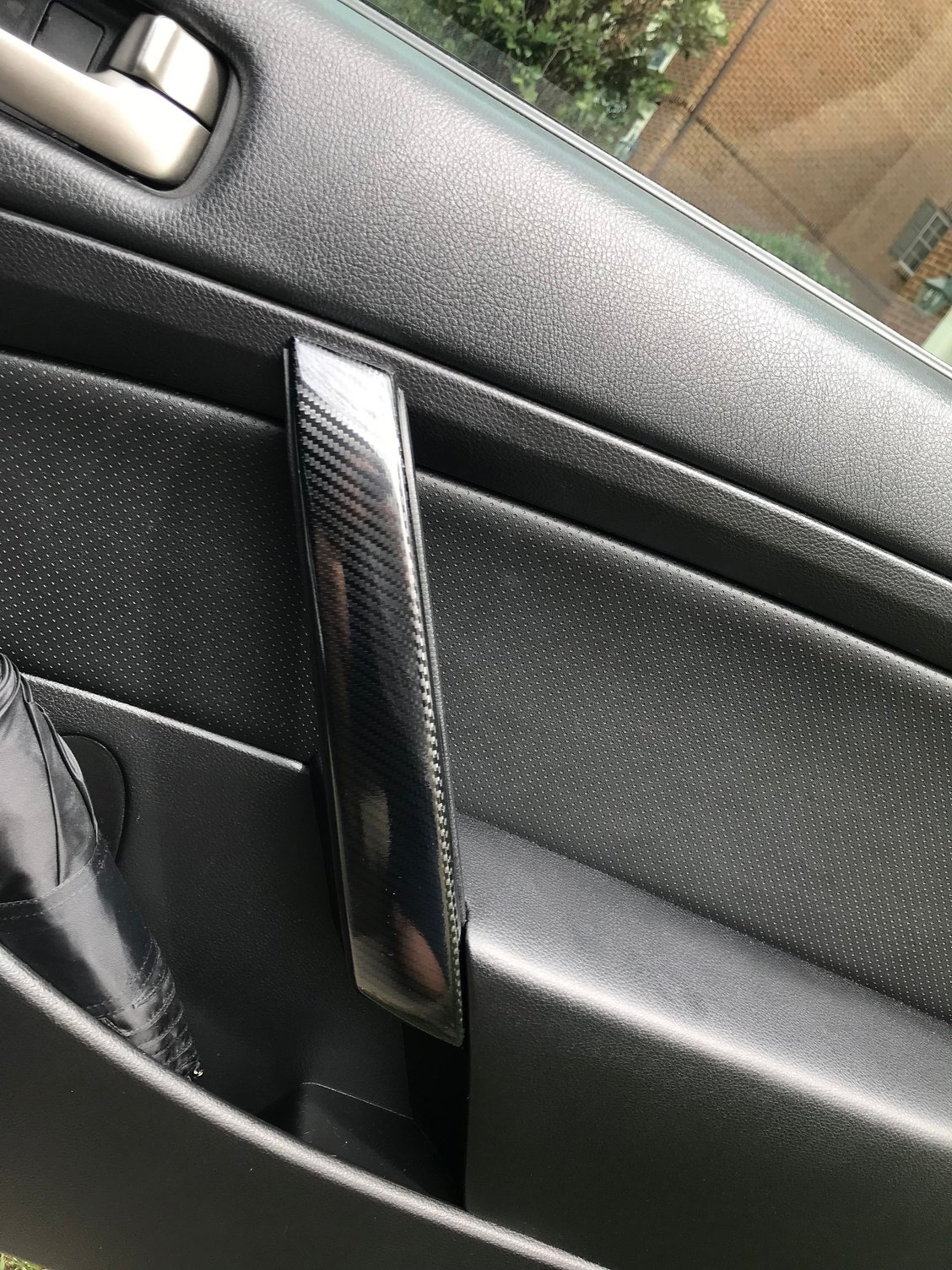 Speaking of wrap, I was tired of the silver fading and scratching on the door pulls so I wrapped them. I like the look. I intend to next wrap the side panels of the rear body on the inside where the perforated faux leather inserts used to be before they bubbled up and I pulled them off.