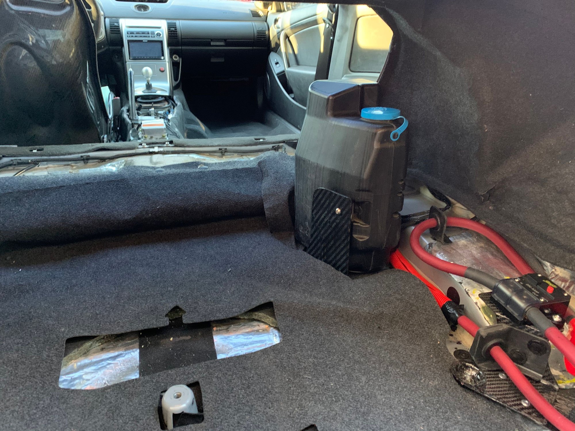 I also relocated my washer bottle to the rear of the car. Ever since I installed my new front splitter, because of the venturi tunnels built into the splitter I had no space up front for a washer bottle (it sits in the bottom right corner of the bumper, right where the splitter tunnels are now). So I had to find a different solution. I bought a Nissan Armada washer bottle (nice more square shape) and swapped the washer motor and ran some plastic tubing to the trunk area. The level sensor is the same as the G and now everything works. The only thing I am missing is an additional carbon fiber bracket to keep the bottle more tightly in place.....but that wont happen until I rebuilt the Edwards vacuum pump.