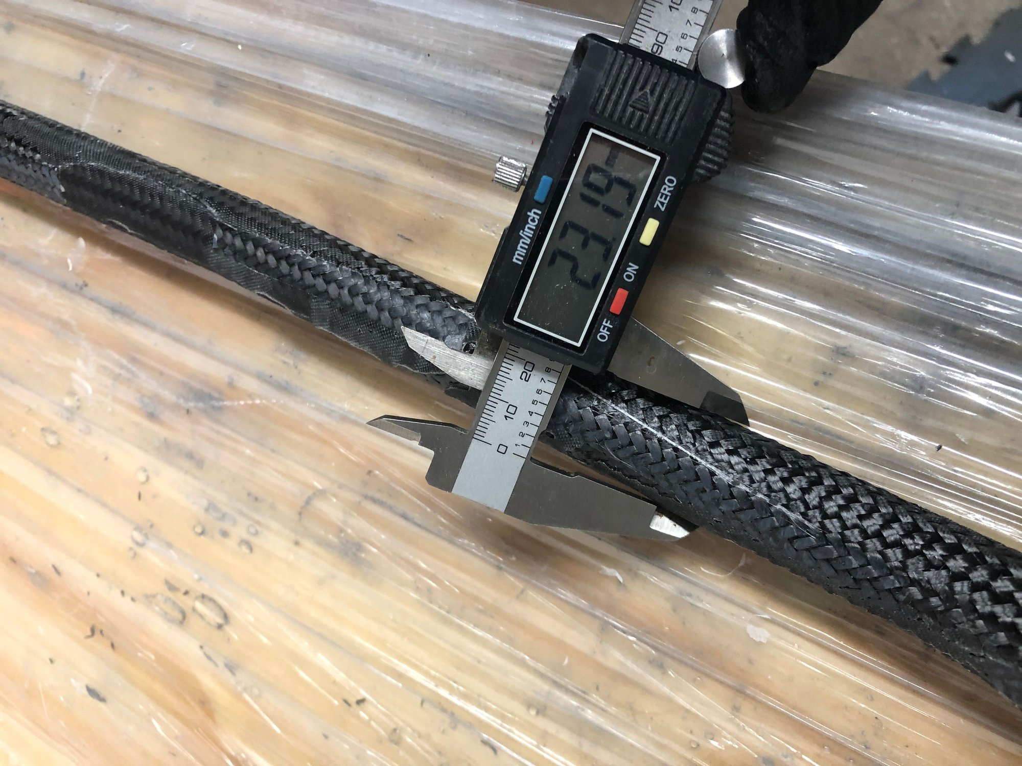 Result is a bar that is now up to ~23mm in diameter (initial core diameter is 18mm). So I built up about 5mm in diameter and goal is to keep building up with infused CF layers until I reach a maximum diameter of 35mm...hopefully by then the stiffness will be comparable if not higher than the Hotchkiss version.