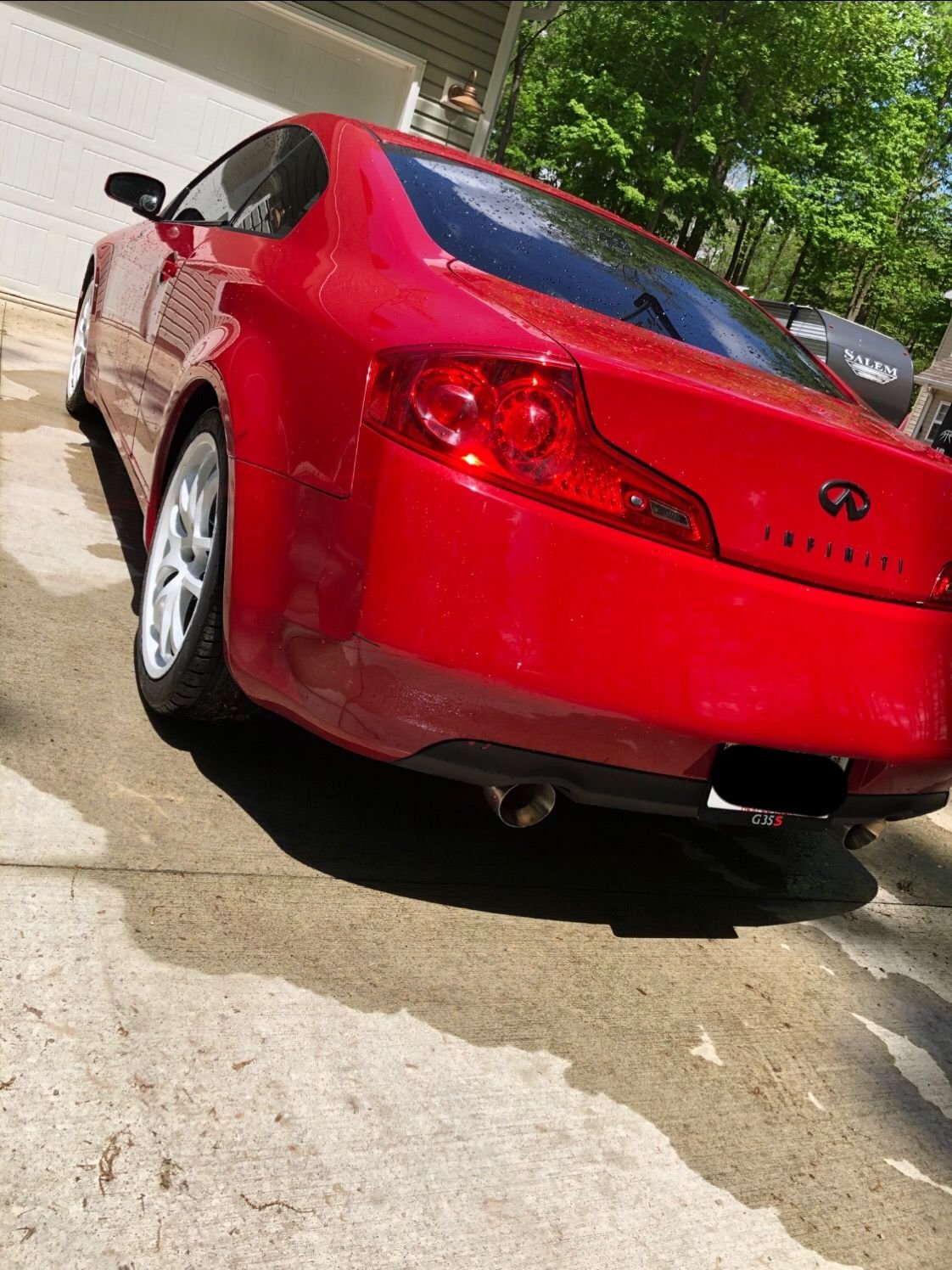 Once quarantine took over, I had no other choice but to do some cool little mods to the car that were cosmetic, and would make a difference in the look. So, the first thing I did was made the wheels white. I masked the pads, tires, and fenders. They’ll run right off of the rotors after a few rounds of braking. It made the car pop out a lot more, and keep in mind that it’ll look even better soon because since I like the white, I’m going to get them sandblasted and legitimately painted next month, along with the rest of the car. So, it’ll have fresh body paint (I’m keeping it red,) and also flawless, better looking white wheels. Anyway, after that, I went ahead and bought tail lights off of a 2007 coupe. They fit perfectly, and didn’t even have a scratch. But before I tightened them in, I also installed the Diode Dynamics Tail as Turn mod, along with some LED reverse lights. To top it off, luckily, my “G35 S” plate holder came in the same day, and I liked how that looked. I got it because it is a sport, but they actually branded them “S” in the 07 Sedans and on, etc. I then plasti-dipped the badges, after removing the “G35” one. Once that was done, I coated my grille in gloss black. This made it look a lot more like a sport, because I just didn’t really like the black-chrome before. Spec-D clear side-markers were also on.