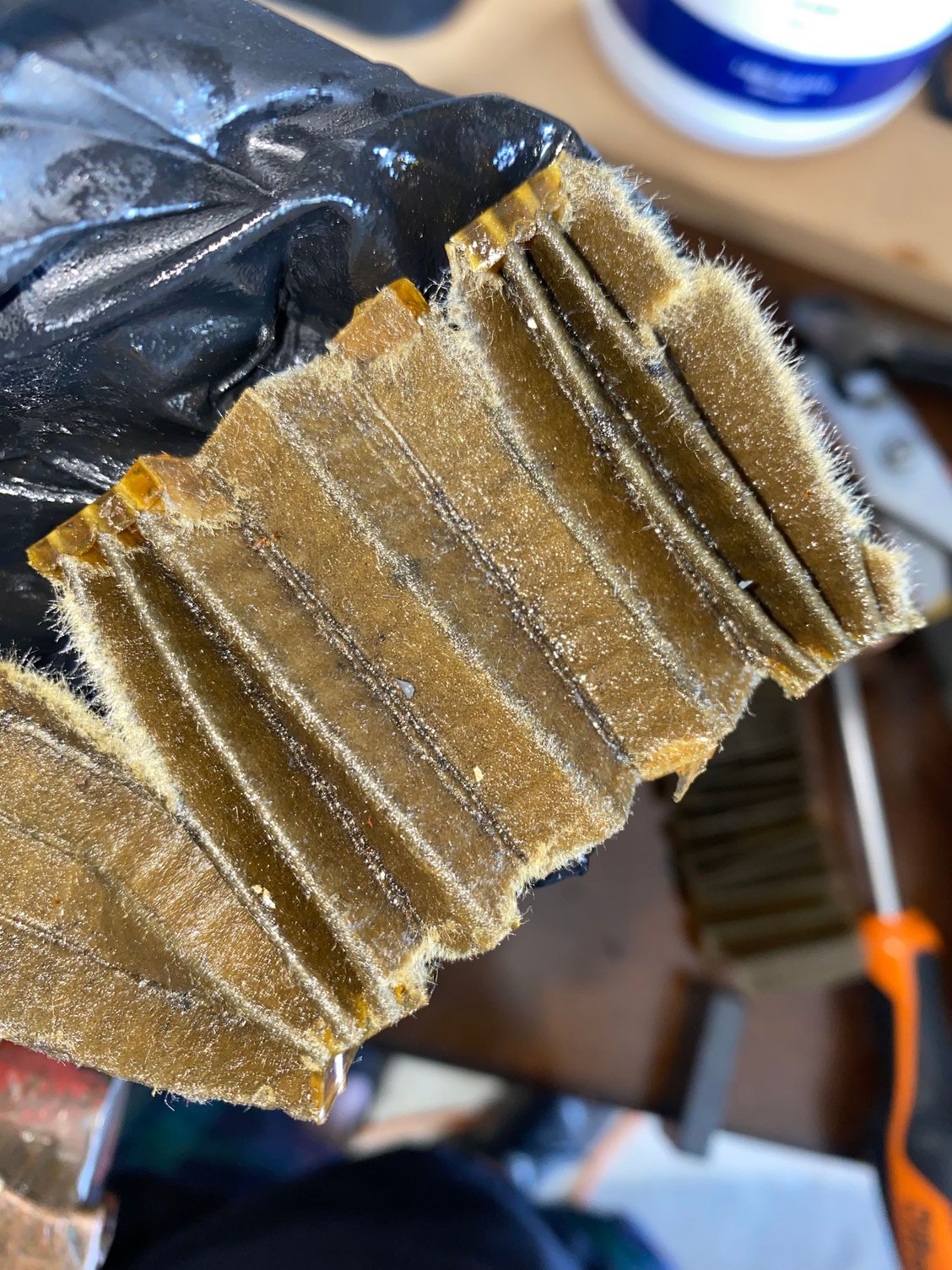 Inside the filter? Take that paper element and cut it completely off, stretch it all out and look at it very closely, especially at the bottom edge that was away from where you dremel cut it.