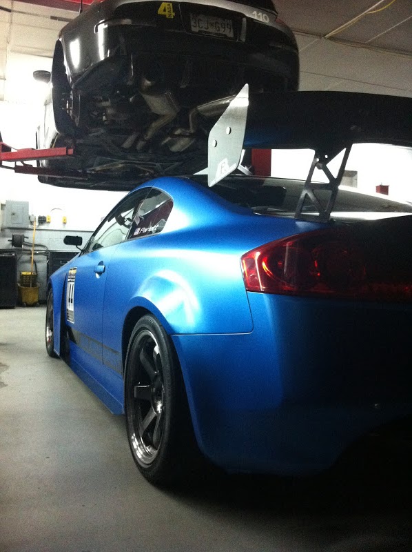 The G's body work was finished on Saturday, the new forced induction system was finished on Tuesday, the car was started for the first time on Wednesday and then wrapped in Phenomenal Vinyl's Matte Metallic Blue Azul vinyl on a 24 hour stint Wednesday night with the help of Jason from 7pm-7am. Thanks to Brett and Matt from Phenomenal Vinyl but more importantly I cant thank Jason enough for spending a delirious night with me wrapping the G. With all of that craziness done and sleep non existent, we used Thursday to button up the last few things on the already built SOHO 350Z "Mule" car and the last few wiring and engine things on the G Thursday night in preparation for the dyno Friday morning and the 5 hour trek from our shop to the Z Nationals in GA.