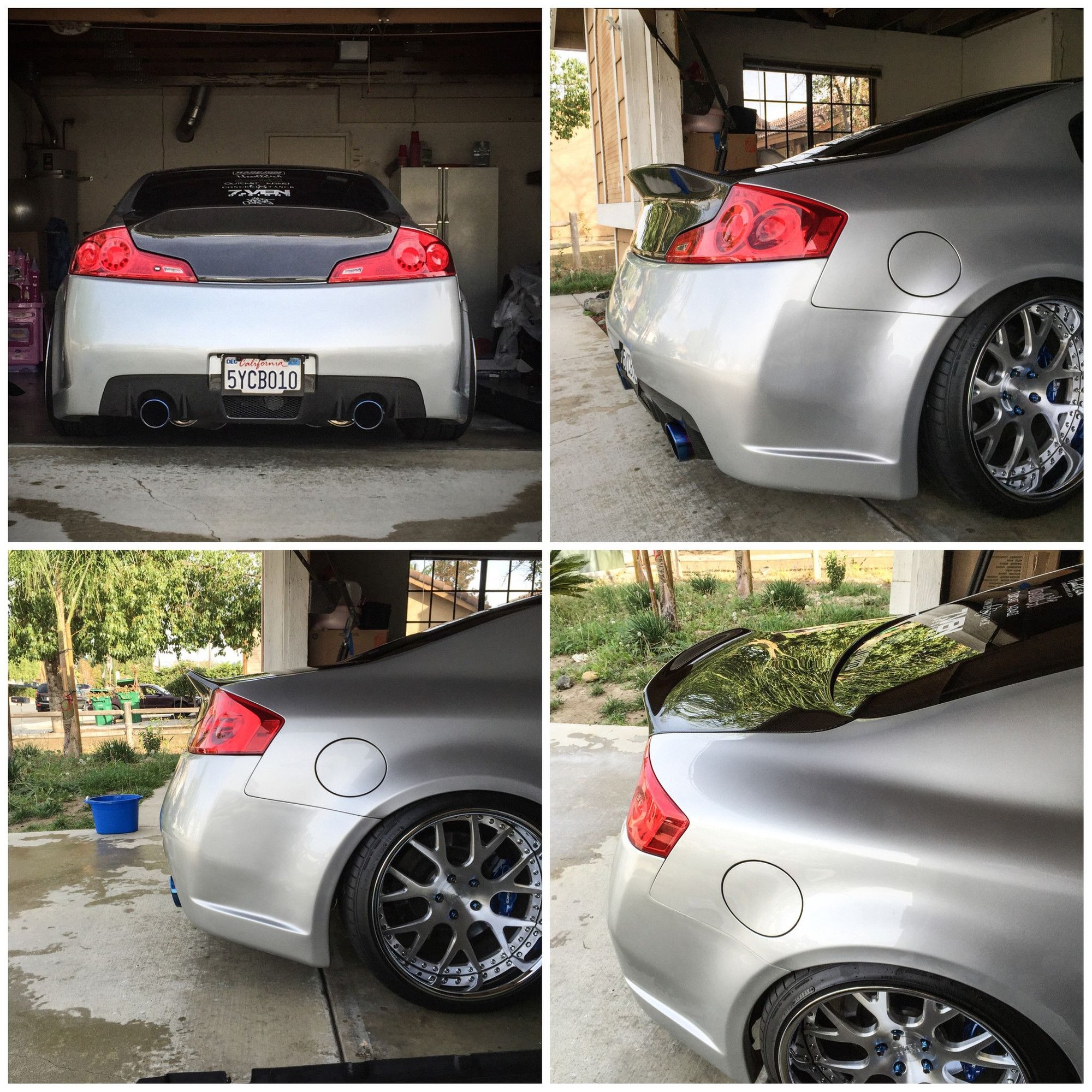 Hey, I recently bought my silver 04' G35 but the spoiler on it is washed out/chipped as all hell and looks abysmal. I'm thinking to get it fixed up and have the paint matching its going to be over 200 dollars, so I just want to replace it all together with a new black spoiler. I have about 100-150$ I'm willing to spend.