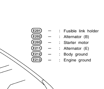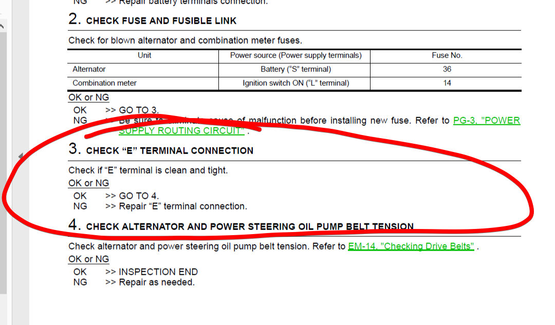 E is part of the fusible link. Section PG - Power and Grounding all the way at the back of the document usually on the last page. I'd have to do a little digging but I think it's the wire bolted onto the top of the fusible link that goes out to the starter/alternator.