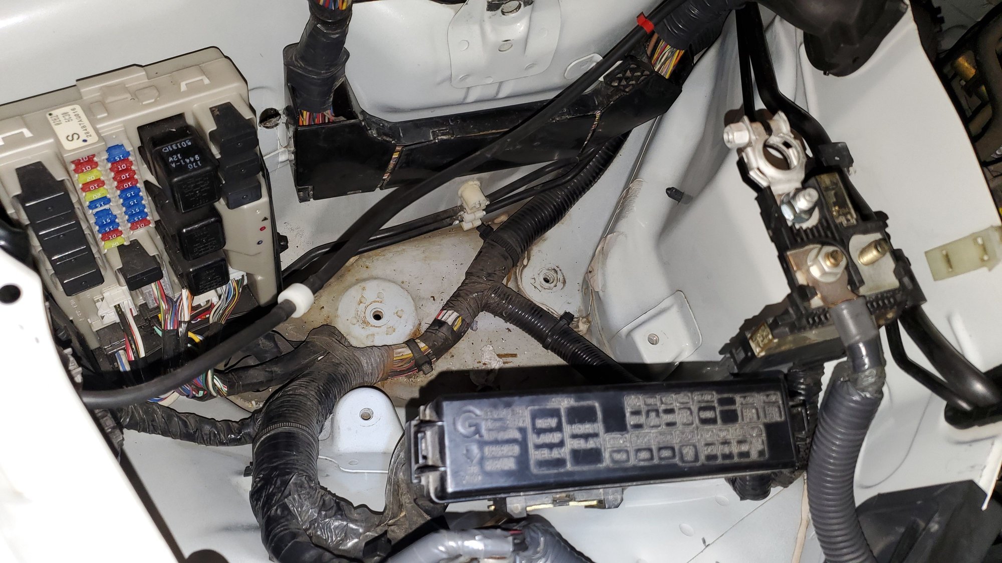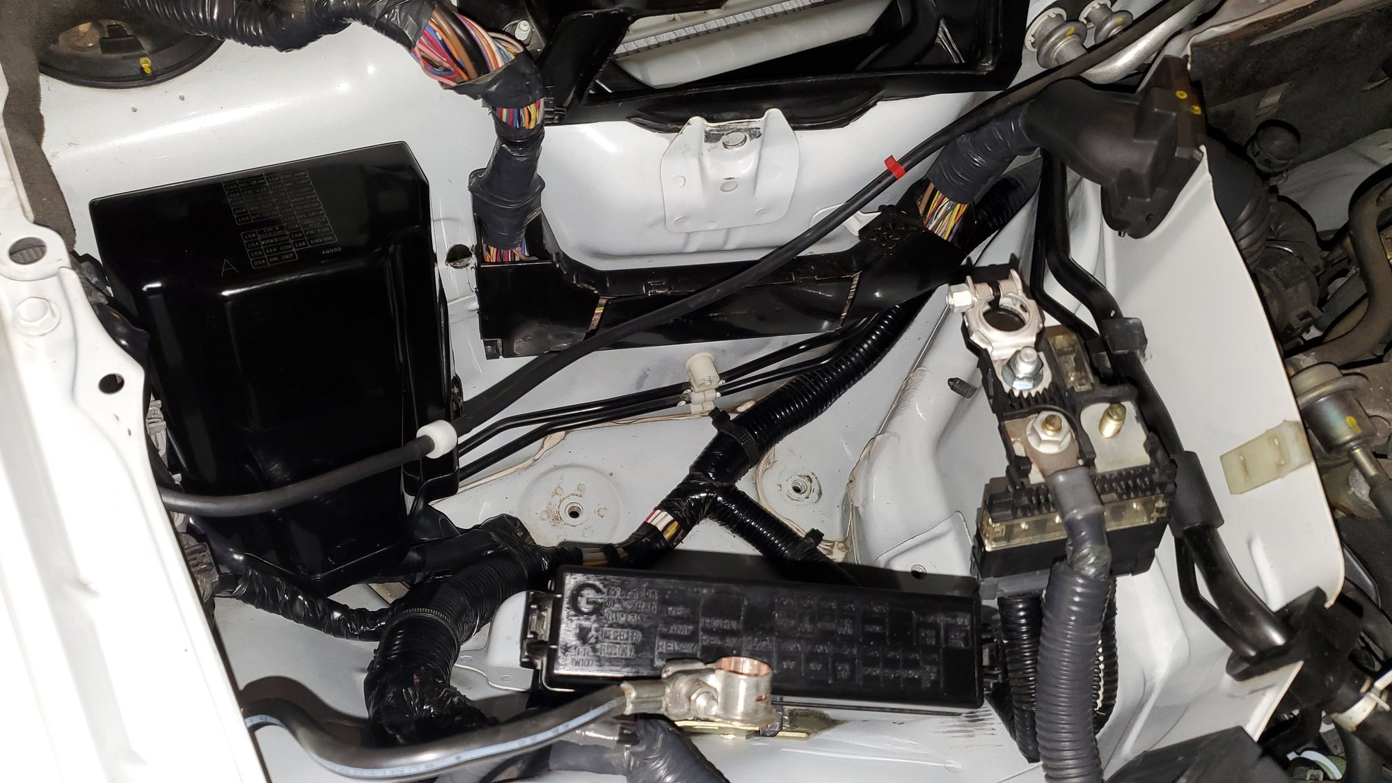 Bay looking dirty, I already wiped the walls but the bottom was a little tricky. I couldn't get into the every nook, gotta pick your battles though. Also, I learned there is a second fuse box behind the battery!