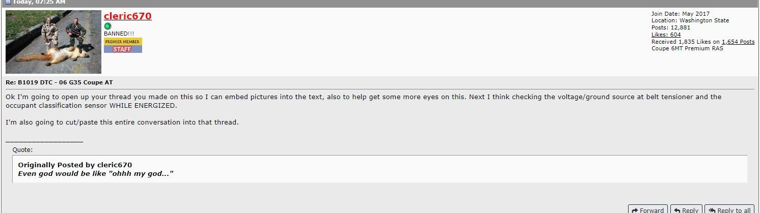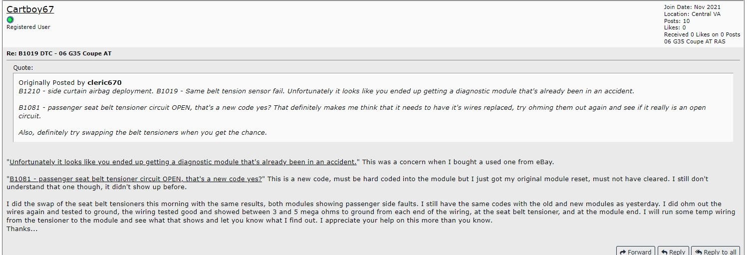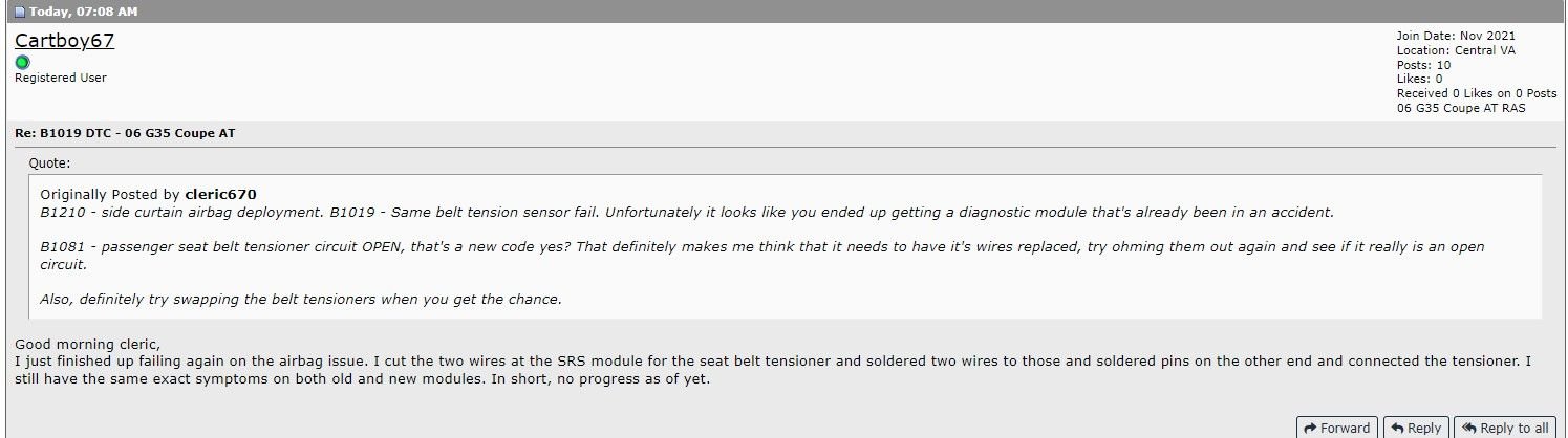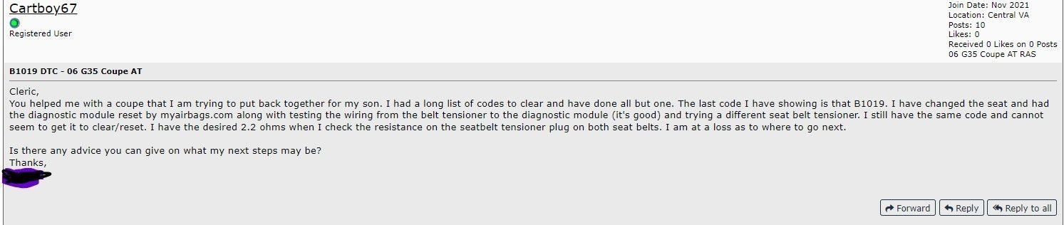 I wanted to follow up on this, I took some time off from the car due to some other things that took precedence. I got the new seats and installed them, still have two items of concern. The B1019 code is still coming up when I scan and the air bag light on the instrument panel is flashing a code that you posted earlier in this thread, in maintenance mode is 7 sec on, off, 3 sec on, off, then 5 1 sec flashes, then it repeats starting with the 3 sec on.