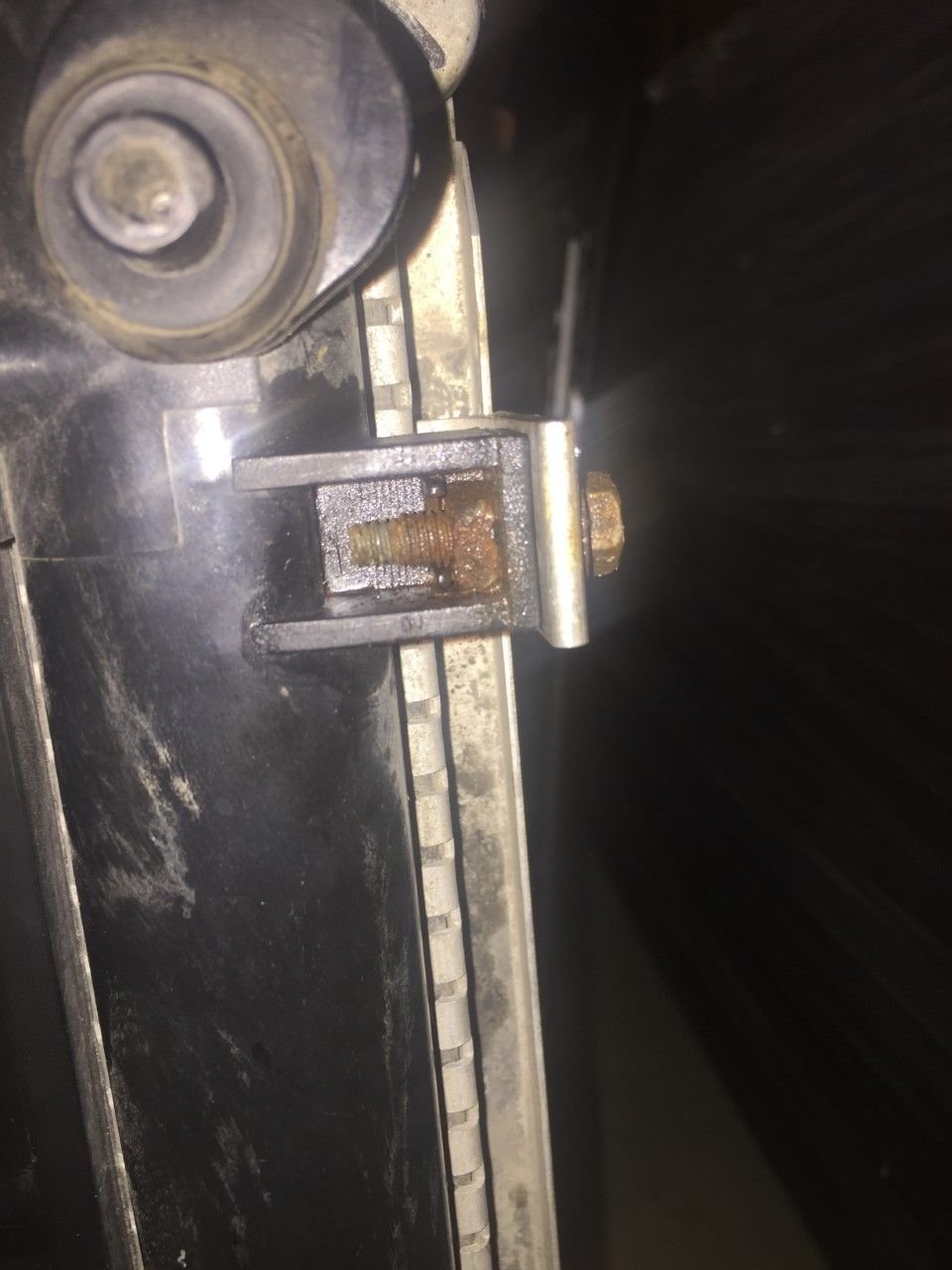 Have someone hold the radiator and use the sprocket end of a long wrench (to add a larger torque or moment to bolt) and twist slow. It'll come off. The less rustier bolt was easier.