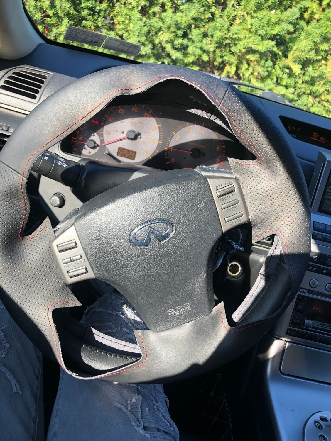 Thought I’d post this after not seeing ANY posts about steering wheel restoration for the G35. If you’re like me and bought a G with some miles on it within the last few years, it’s likely your steering wheel is not in great condition. Personally, mine continuously flaked into my hand after long drives, and it couldn’t be cleaned without leather flaking into whatever I tried to clean it with. After conducting what seemed like hours of research, I seemed to find that my only options for fixing this issue would be to either take it to get rewrapped which would cost up to a few hundred bucks, try out “Wheelskins” (which will rewrap the outer portion of your wheel, but doesn’t cover the spokes and doesn’t look that great or comfortable in photos I’ve seen), or get a cheap Autozone/Walmart wheel cover and call it a day. None of these options seemed to satisfy what I was looking for, so I kept looking and found these leather stitch-up wheel covers all over ebay for the newer Infiniti wheels, 350/370 wheel, etc. but absolutely nothing for the g35. Only similar product I could find was the Redline Stitch-up cover, but that’s $130 in itself for a leather wrap that ebay wants ~$40 for other car models. So deciding that this leather wheel wrap would be the best option for covering my beat-up wheel, I looked at quite a few photos of the 350z ebay/amazon steering wheel cover and compared it to my own G wheel, and (after some debate) deciding that the similarities were close enough for me, I bought a 350z cover off amazon prime so i wouldn’t have to wait for ebay speedpak bullshit. It came in 2 days and I got it fitted over the wheel immediately, and after some learning experience, I got it stitched up in a couple hours. It needed some tying off in the inner spokes to look right, but the leather cuts from the 350z will stretch just long enough to tuck under the buttons and look clean on a G wheel, as if it was professionally rewrapped. It slightly reshapes the spokes since it is technically for another wheel, but it fits very well for the most part and I am very pleased with how it came out on my wheel. For $35 and some patience, this is a much better option than a rewrap or a Walmart cover that will slide every time you cut your wheel hard enough. Here’s a few pics, let me know what you think.