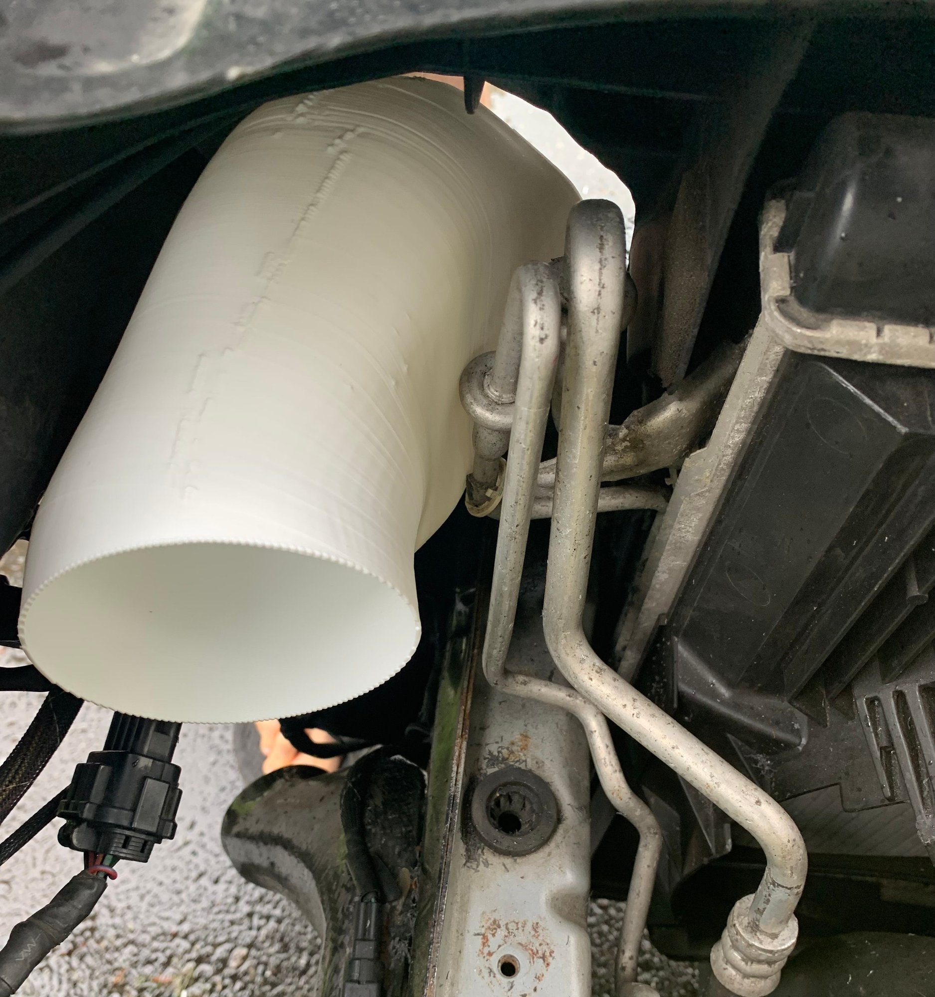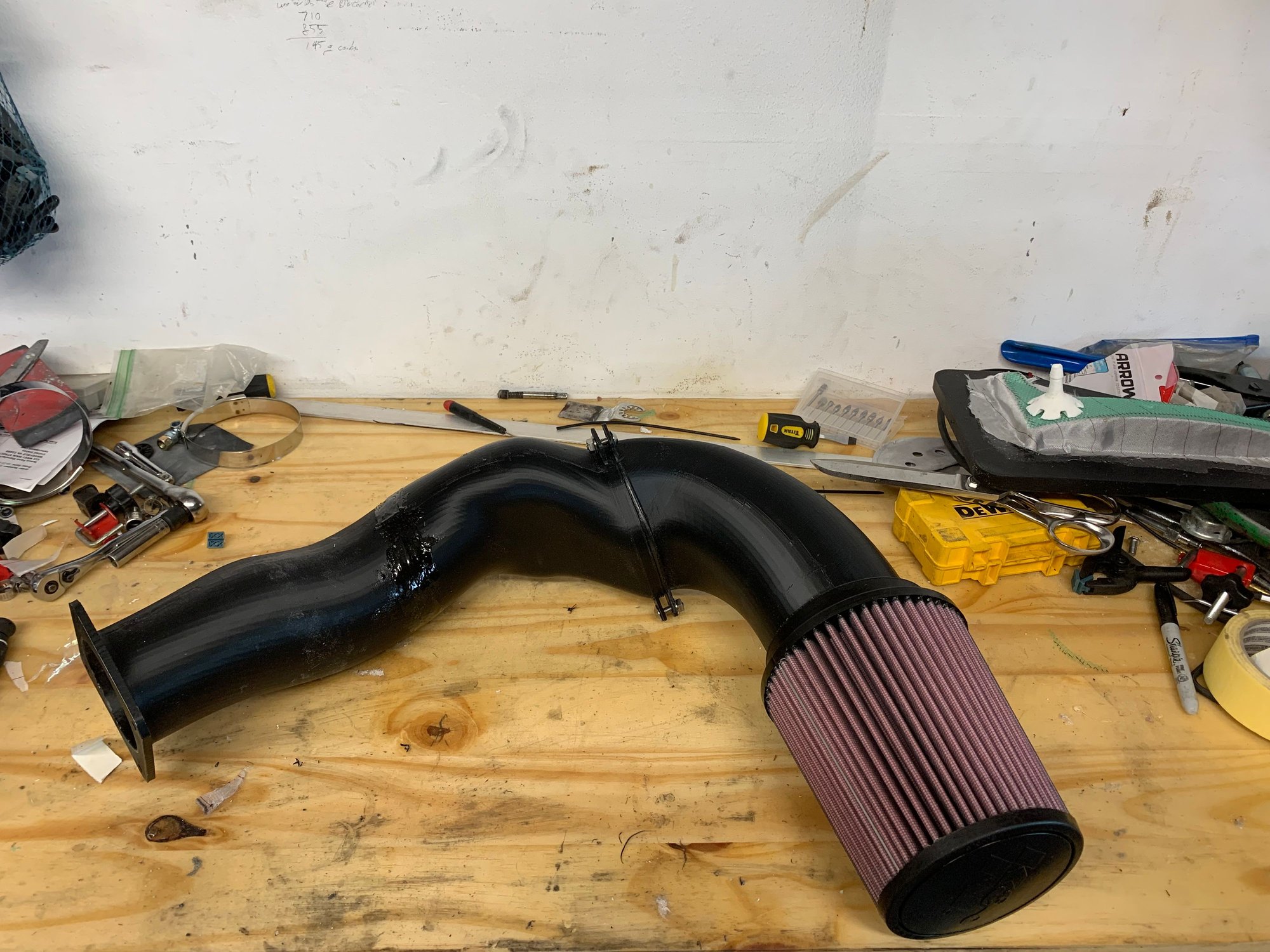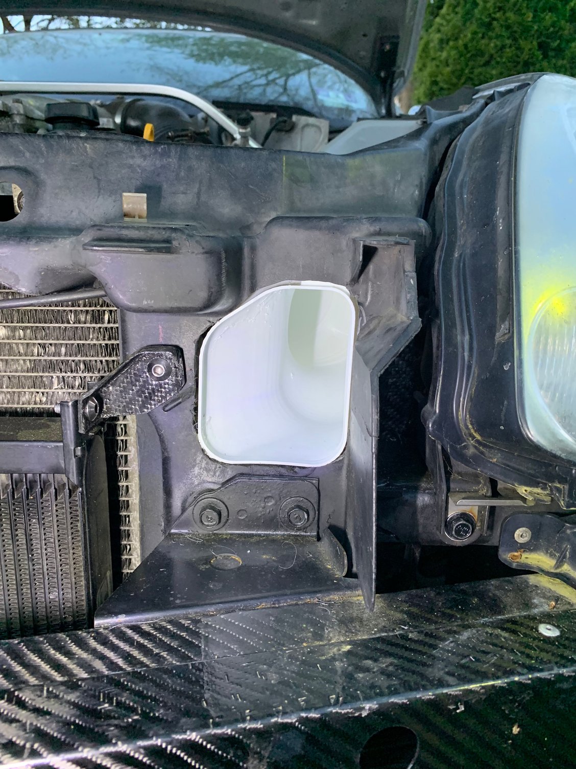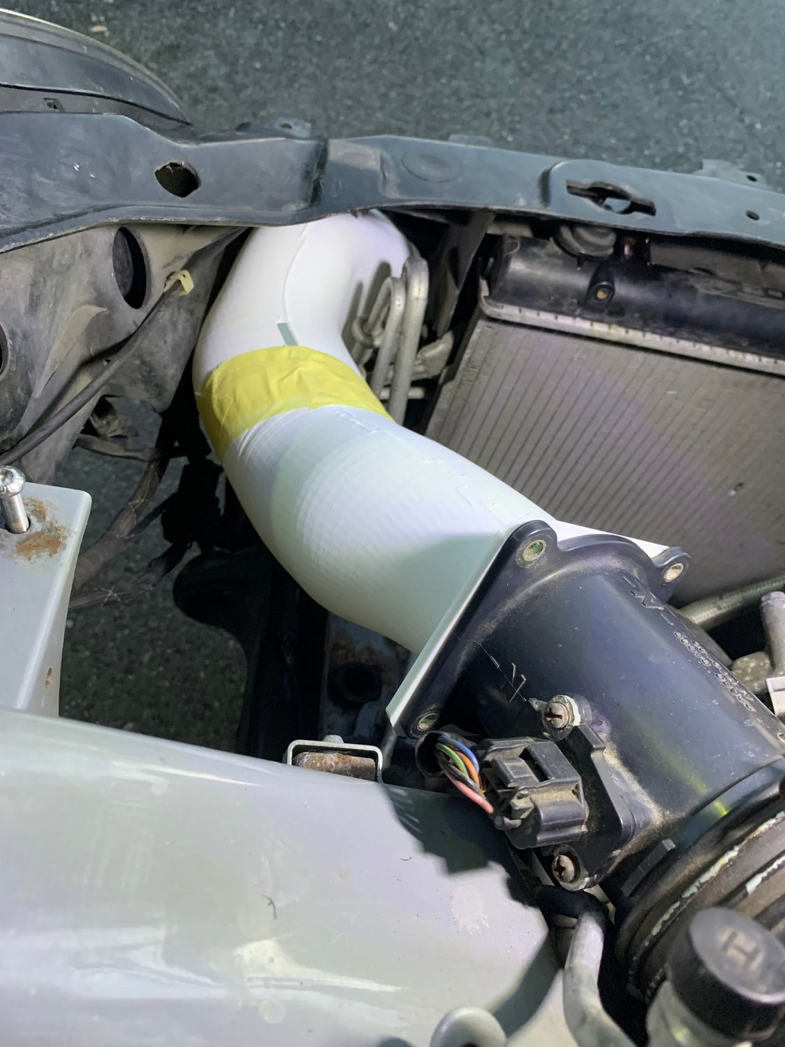 Almost there. The 3d printed prototype intake tubes fit nearly perfectly. Unfortunately this version doesn't allow the bumper to go on all the way....a few millimeters too tight. Need to adjust the drawing and re-print...but i'm almost there and will order the carbon fiber sleeve tonight so I can print these in ABS and get them finished in carbon asap.