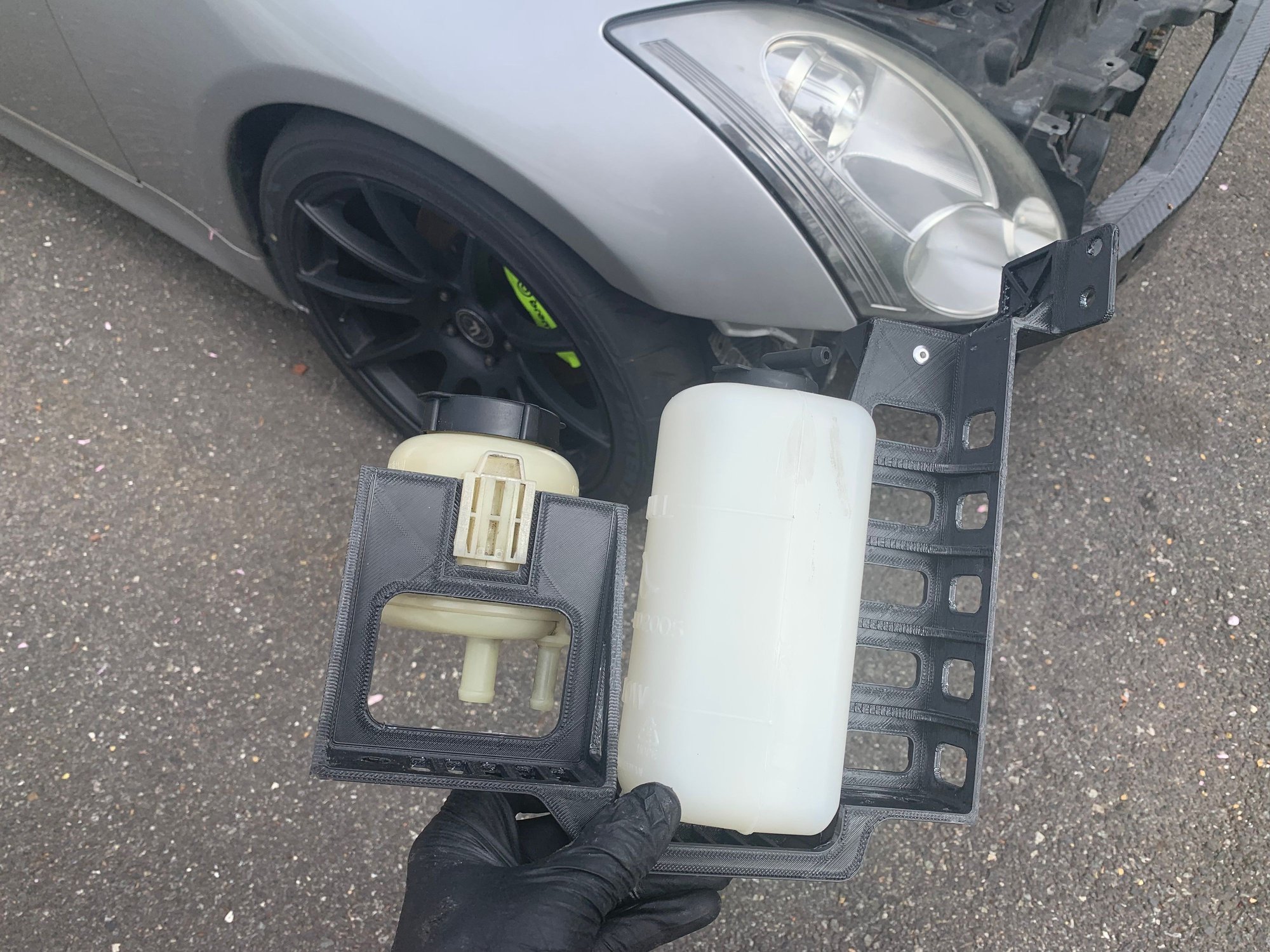 PS reservoir and coolant overflow relocation bracket is done and looks and fits great printed in ABS. Just need to finish up the hoses. Not sure why Nissan decided to use a 5/8 and 3/8 hose on the PS reservoir when the same flowrate goes through both, but ok...is what it is.