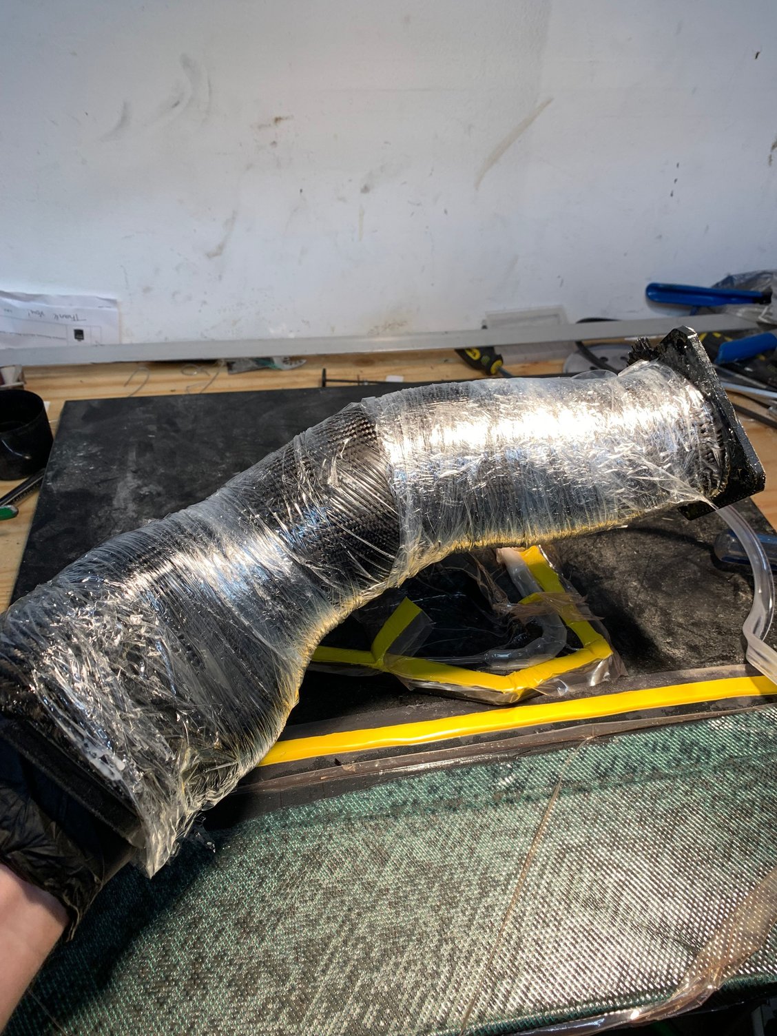 then I wrapped it in carbon by hand and applied resin with a brush. This time I didn't use infusion, because I want to keep this simple and fast, so I used some plastic wrap to keep the carbon tight-ish. In the future if I re-do this I have some ideas about how to make this entire part using a carbon infusion process.