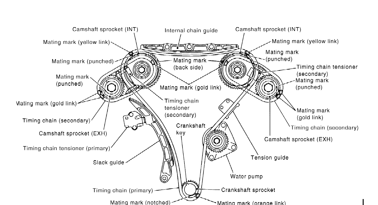 That guy actually made it more confusing. He calls the elongated punch marks dashes. The illustration i posted just calls the elongated punch marks punch marks, from what I gathered by watching almost every video out there the double dots are on the left and the double elongatedare on the right. Unless things have changed #1 cylinder has to be at top dead center then marks all set and thats what I did. I did manually turn the motor over 5 or 6 times where the red link came all the way back to top dead on the crank and the marks on #1 and #2 camshaft banks never did return to the way I set them, double dots left and double elongated marks right with the yellow links on there punch marks. It did not jump any teeth in doing so.