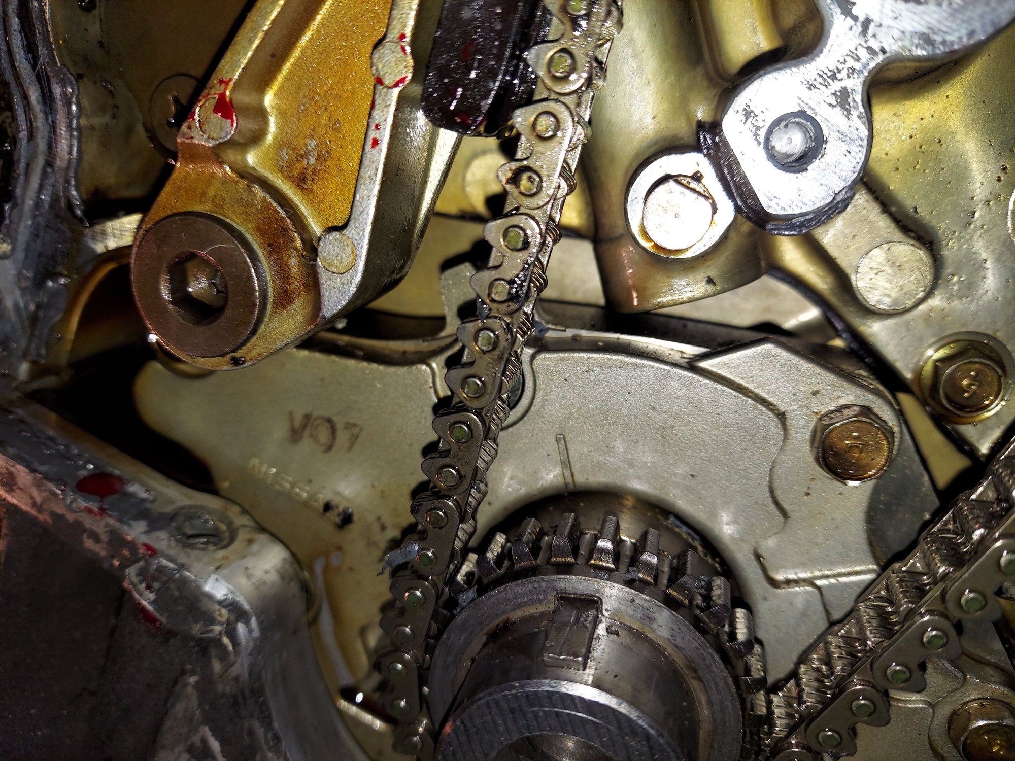 Ok in doing some more research I seen a post from a infiniti expert that it takes somewhere around 45 cranks of the engine to be back in sink. What I'm saying here is the right bank the different colored link is off but the marks are on can this mean that bank is out of time and needs to be turned till that link is where it should be? This side was turned a few times for whatever reason do I need to turn that back?