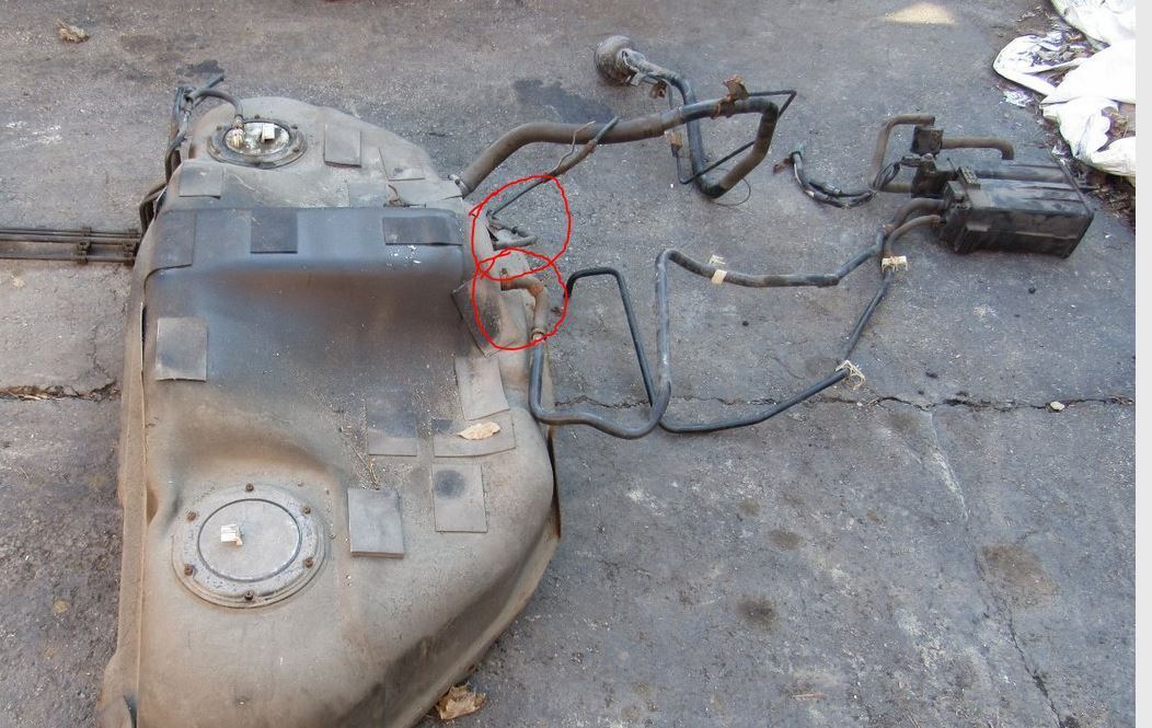 A closer look at where the vent line and evap canister line connect to the gas tank. The smaller device (top) is the vapour cut off, and the larger device below is the fuel liquid separator, which prevents liquid gasoline from entering the charcoal canister.
