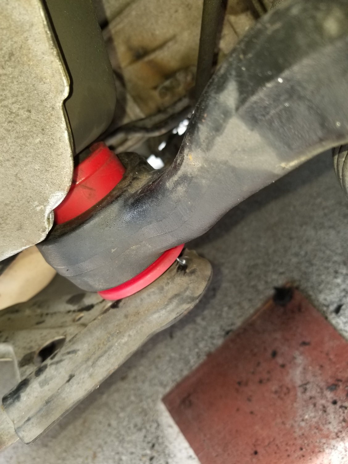 here's my ghetto rigged temporary bushing. There is about an 1/8" play around the center sleeve, but better than 1/2" play of metal to metal.