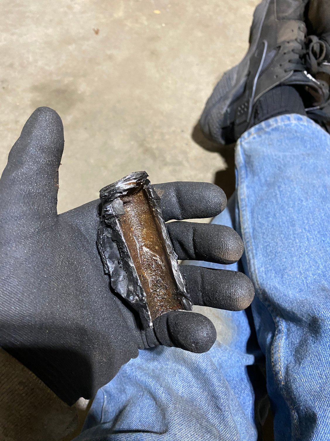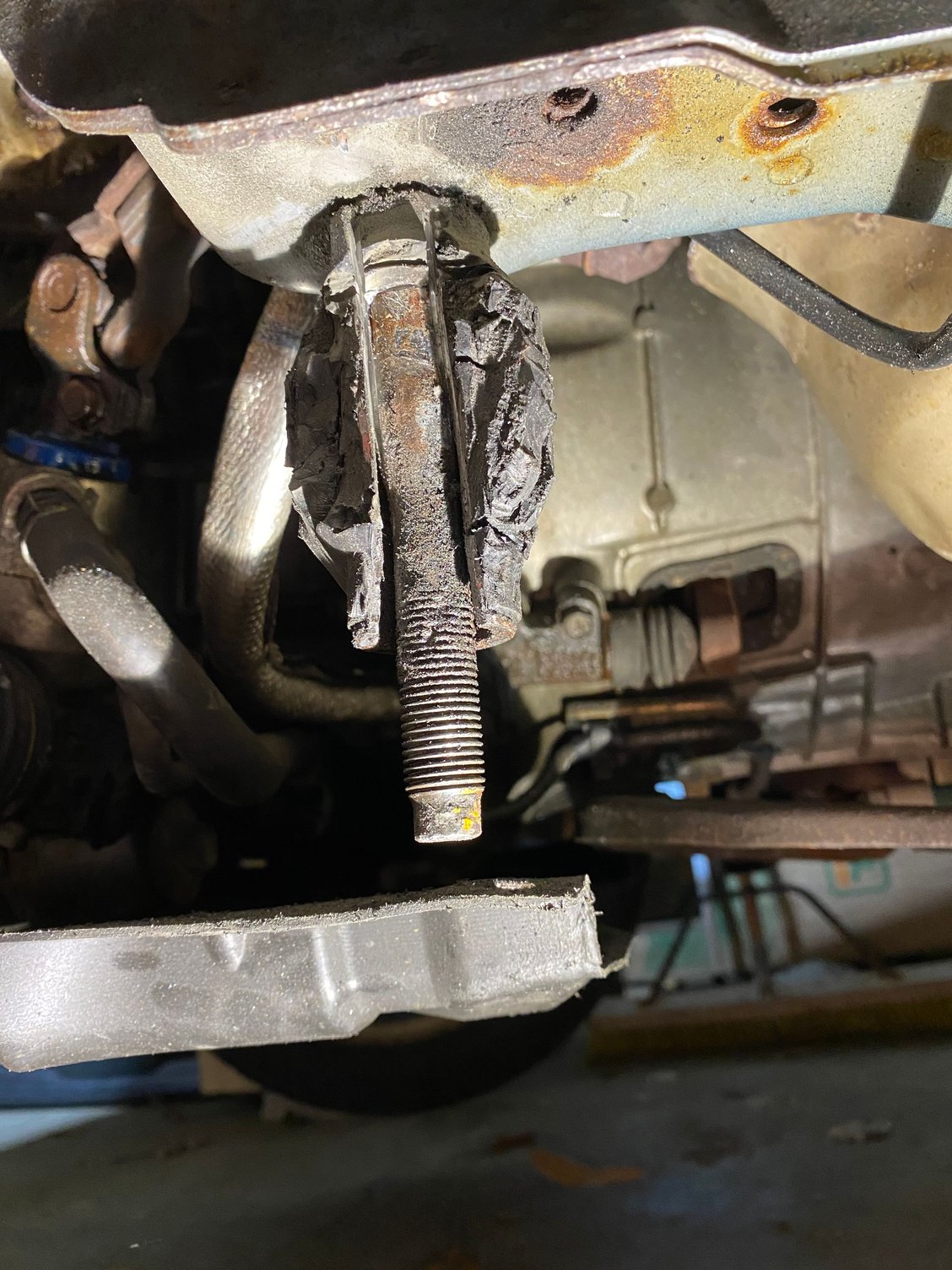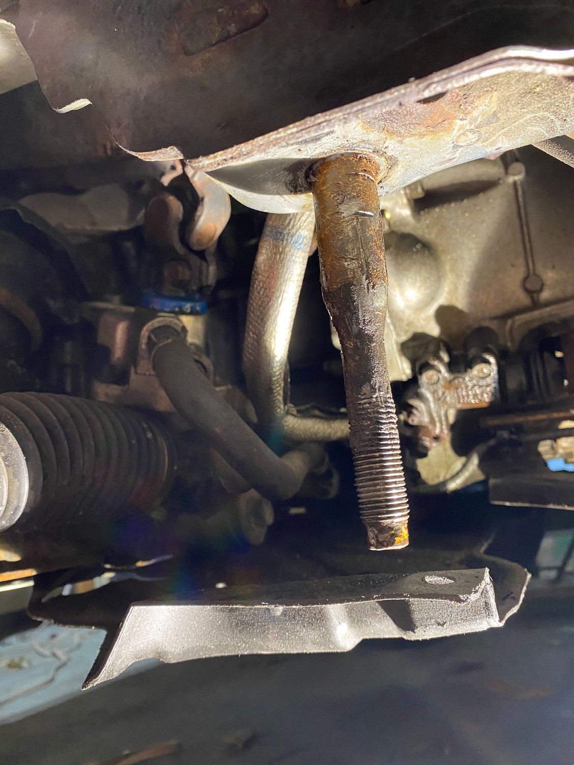 As you can see, the stud is tapered. I actually made a bunch of very small cuts, taking out a piece at a time until I reached this stage. From here, I made my best effort to cut as close to the body of the car as I could to try and make the base of this metal sleeve week. I would cut for a bit, spray with penetrant, hit with hammer and chisel, spray, and hit again. Eventually, I was able to get the sleeve moving, and it was a matter of back-and-forth movement to break the rust and remove the sleeve. Here is what it looked like afterwards: