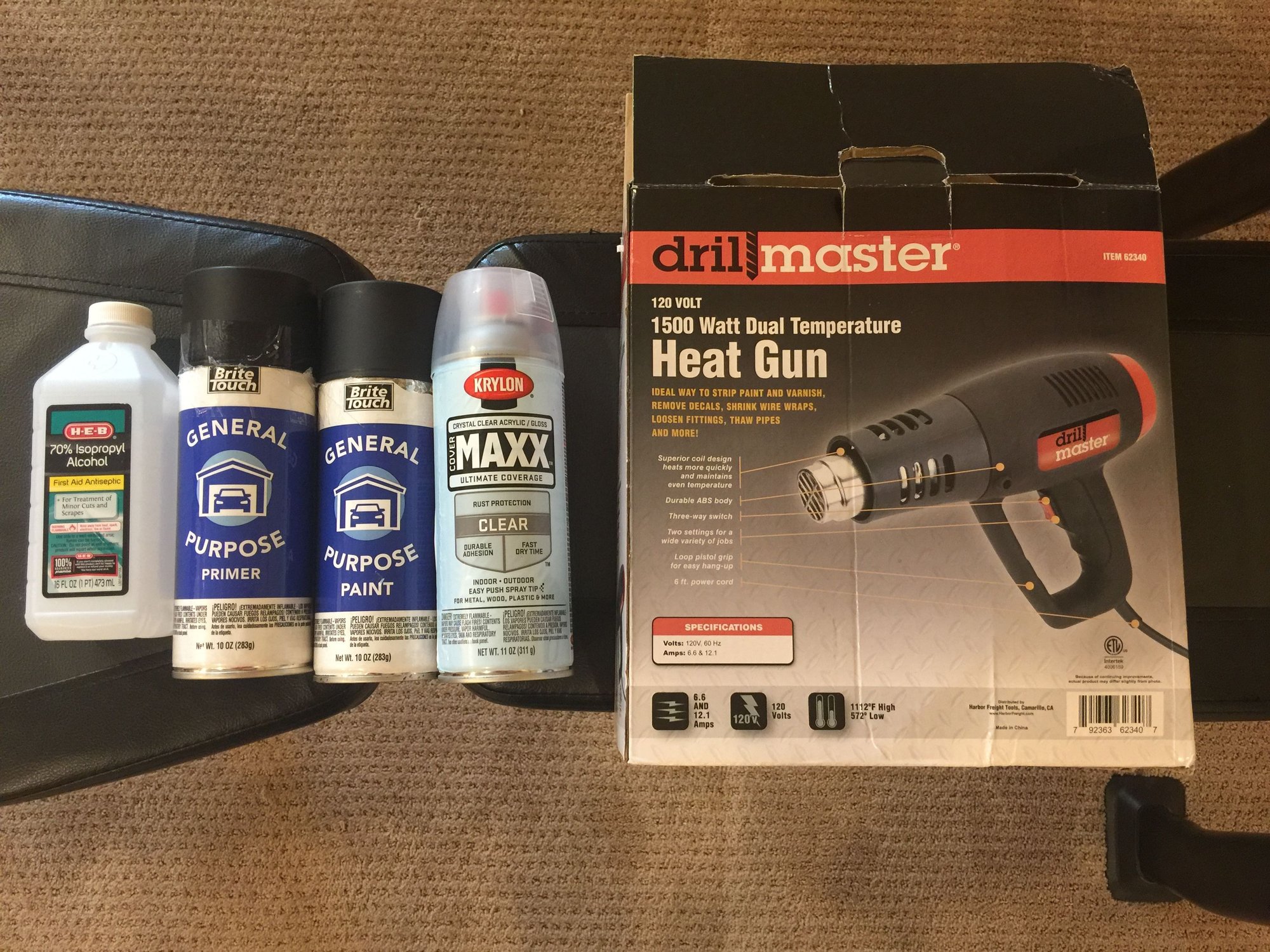 The above video shows step by step how to remove the trim. At O'Rielly's Autoparts we purchased the cheapest (bottom shelf) black primer, flat back paint, and Krylon clear coat.