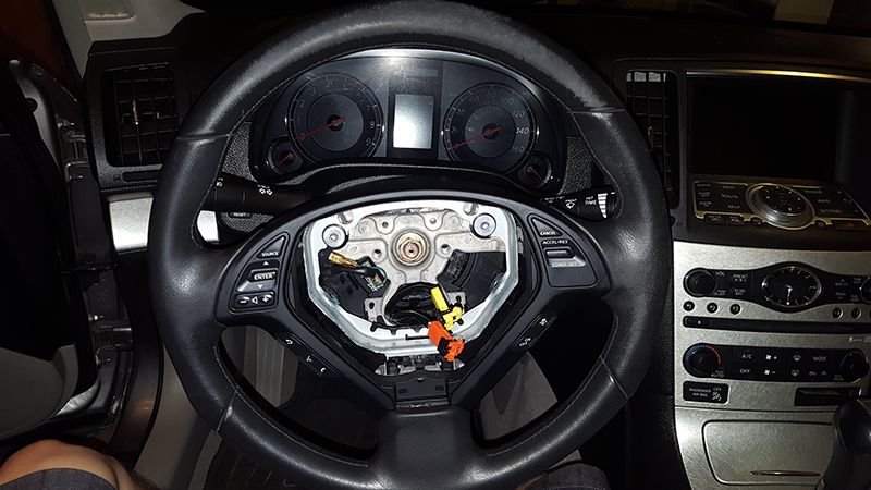 So, I did what most people do when they mod their car, I drank a beer. I decided it would be easier to do this modification with the steering wheel off the car so I popped it off. I wont go over the detail of that, but you can find out how to remove the steering wheel and bezel from http://www.myg37.com/forums/d-i-y-in...ement-diy.html which is a decent writeup. I used this when I replaced the steering wheel trim a while back so taking it off again was quick, took maybe 10 minutes. Having the wheel off the car definitely gives you more access to all areas of the wheel, but mainly I wanted to watch movies inside my house instead of sitting in a hot car!