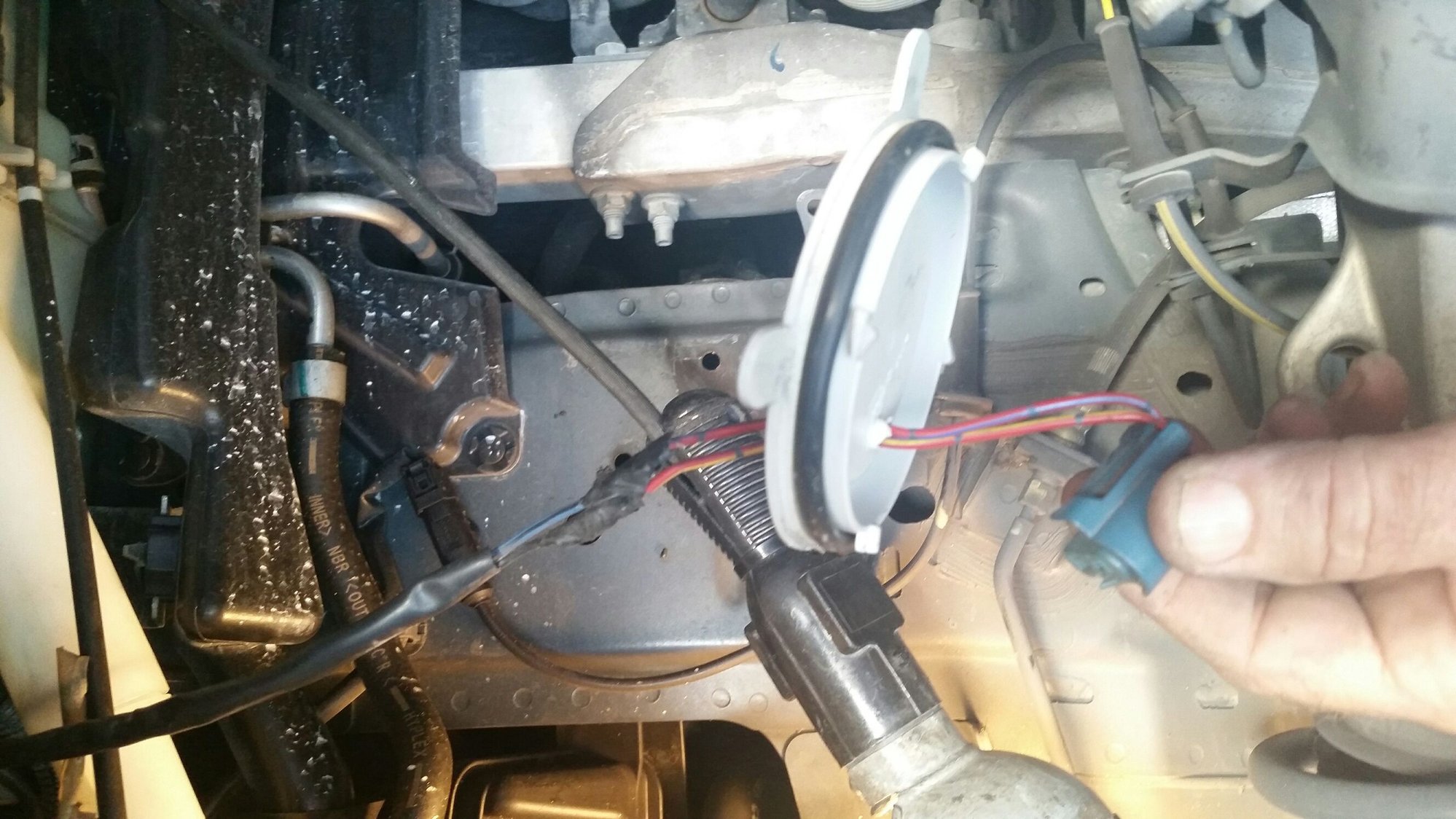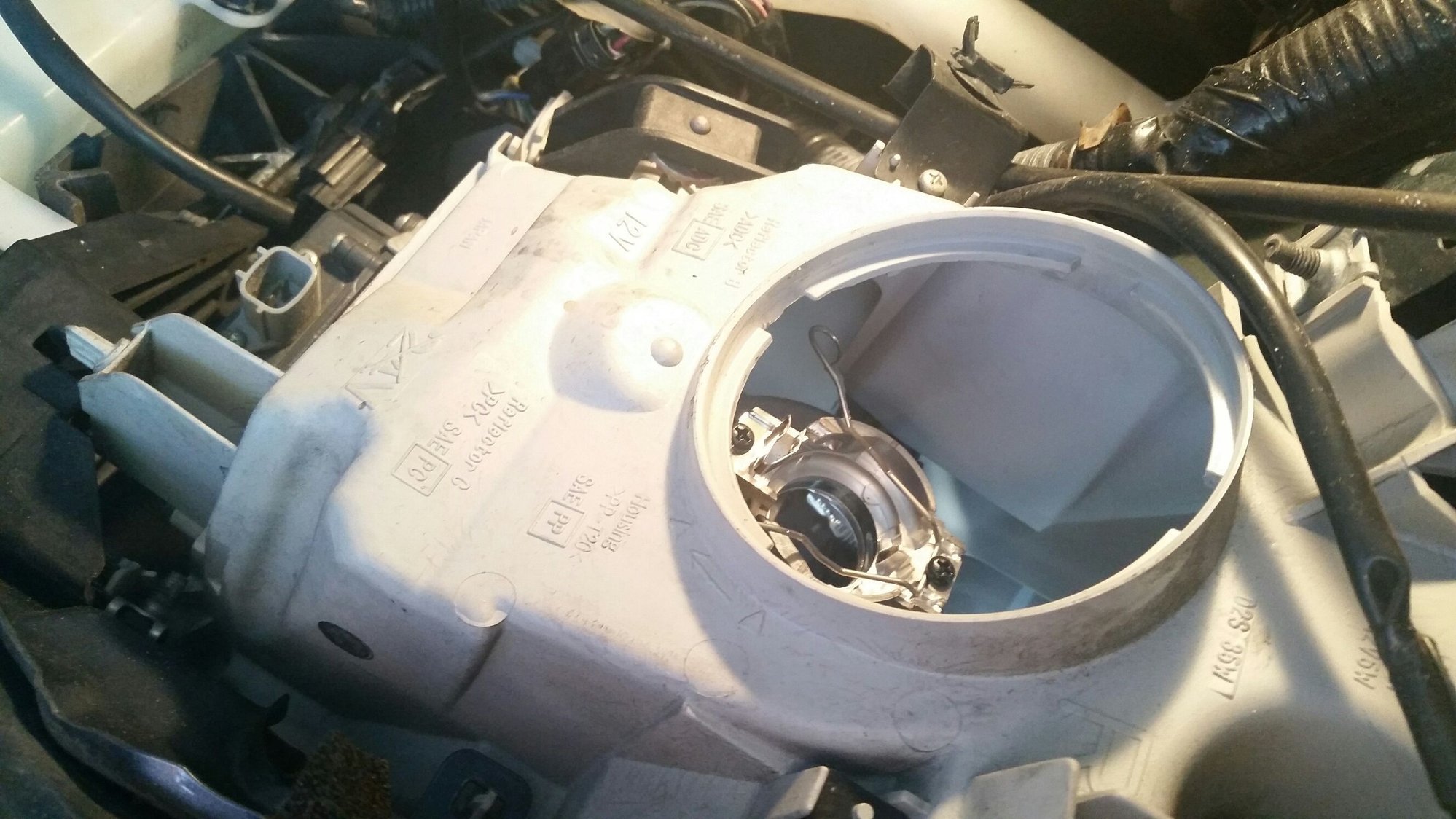 Unused ballast connector on left side. 9005 connector spliced onto lead D2S on light cover (upside down).