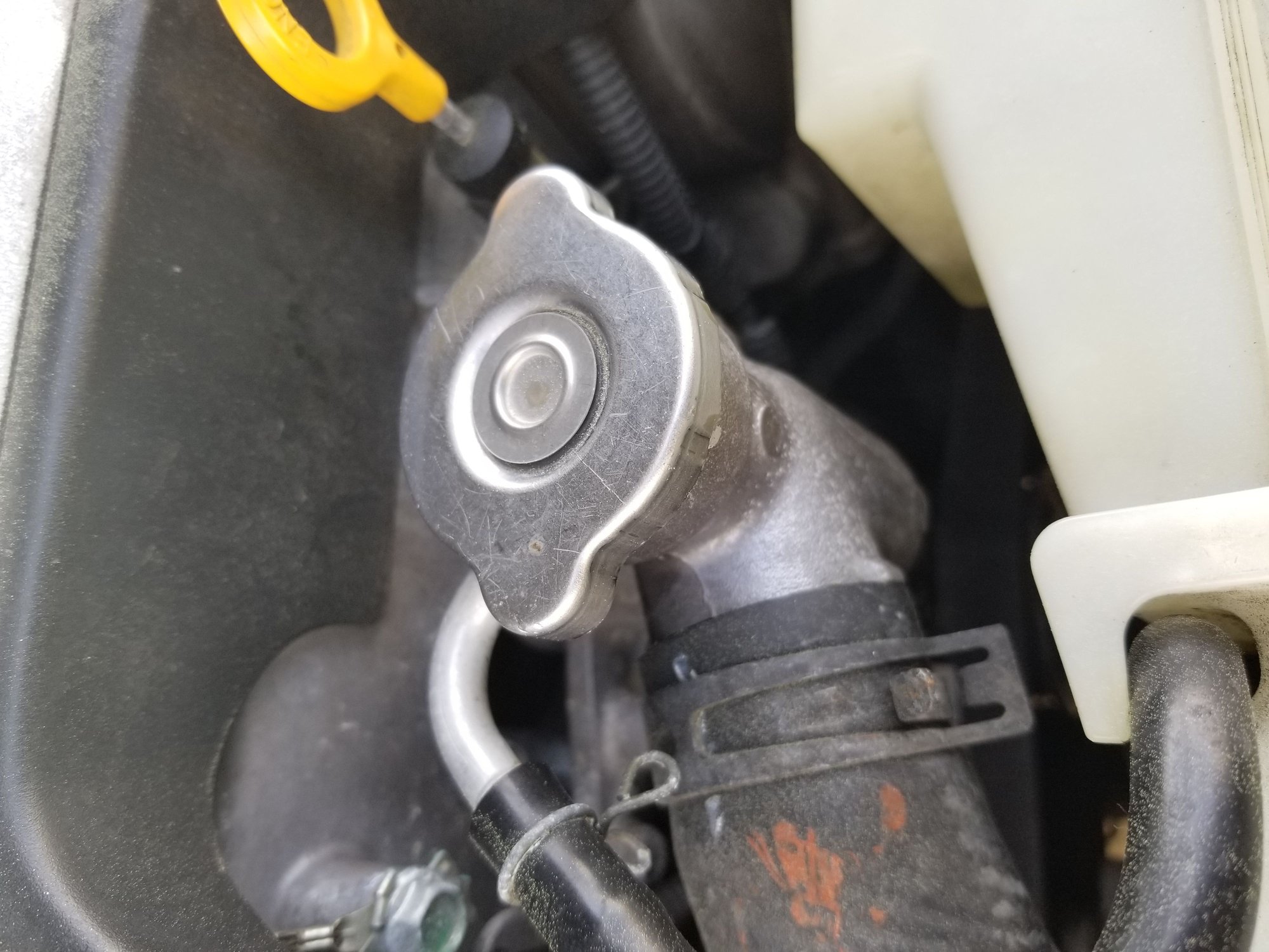 I am stumped and I hope someone can help. My wife (which btw use to post on here years ago with a 03 6MT before life threatening medical issues forced both she and I to sell the 6MT and my all motor 240sx to pay for surgery. She's was one of the reasons I joined this site) drives the 07 Auto Sedan, which since the recent hotter temperatures have brought out some overheat issues. I surprised her with the 07 sedan. We got the 07 in a trade for a Mazda MX-6 and the seller/trader even delivered the car from Fort Bragg area to us outside of Raleigh, NC. Fast forward, the car started to rise beyond the half mark at a stop light and she immediately pulled into a right turn and parked until it cooled down. She threw on the hot air and drove home with no other issues. We started to check things out and took some pictures of areas that may be the culprit. One of the few areas I noticed about the car upon checking it out before the trade was a cracked coolant reservoir. The cap on the reservoir was flimsy and even fell off during the test drive. It was placed back on but when it was delivered the cap was gone. A stopper was put on there which actually fit pretty good and test drove it around during the winter with no issues, so it has remained there since. I went under the car and snapped some pics of the bottom of the radiator to see if there was any damage as this was a salvage vehicle. Dings on the unit that sits just before the radiator but nothing else that jumps out. Also, the radiator cap has no pressure rating...never seen that before. Topped off radiator fluid, massaged the hoses (t stat hose did get hot, so coolant was moving through, top hose wasn't really hot) and let it idle for a while since it seemed to be a little low on coolant. Fans kick on when heat is turned on but I never really saw the fans kick on after the normal drive temperatures were reached. Never overheated but the fans not kicking on still bothered me. Any ideas would be greatly appreciated. Its the 1st VQ35HR in the house hold and it seems alot different that the DE, hell, there isn't even a condenser fan on the bumper side of the radiator lol. Thanks in advance.