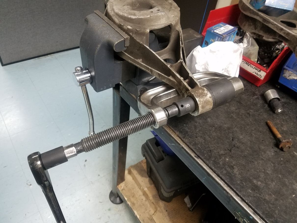 On this vehicle, the front lower ball joints were loose and clunking. The car was also lowered and needed rear adjustable control arms. The tie rods were also swapped since it's one alignment to be done anyways.