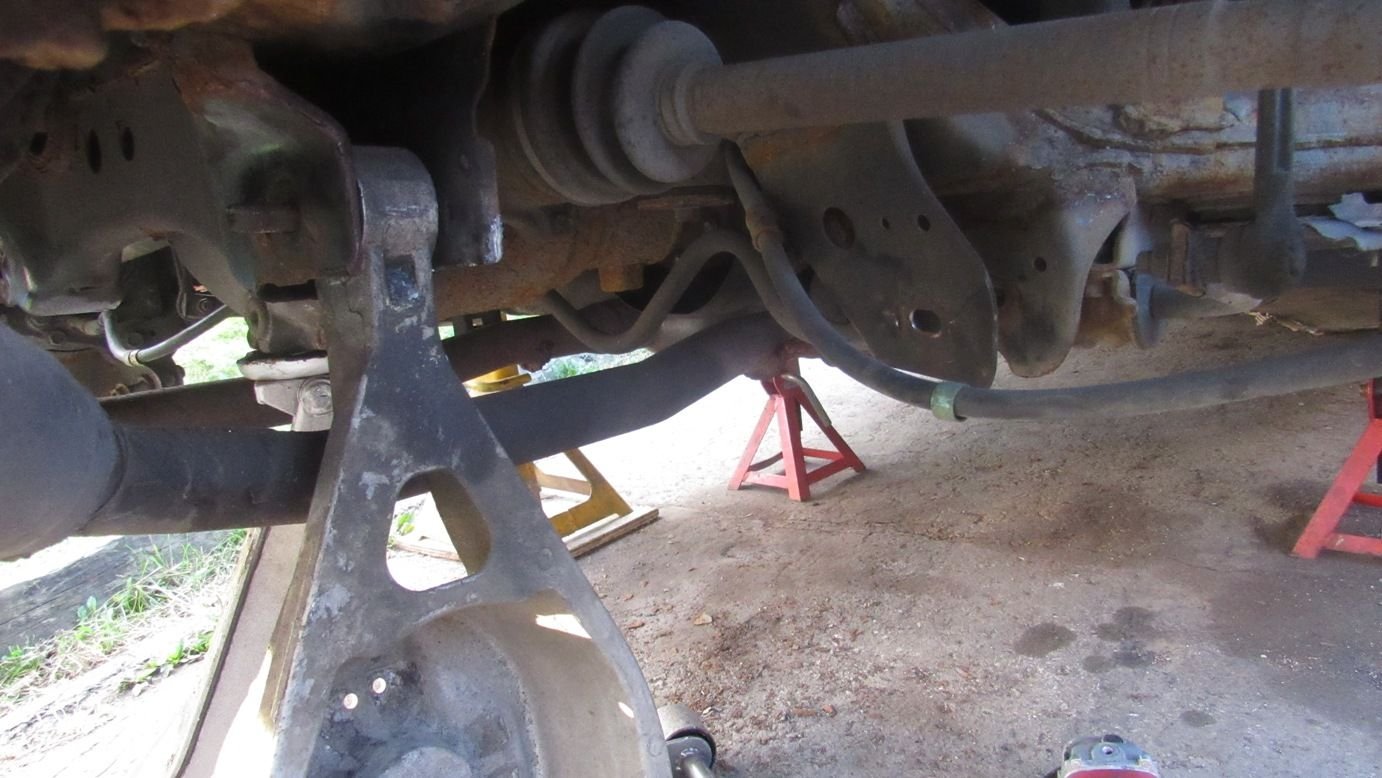 This (rusty) cross brace must be removed to get those bushing brackets out:
