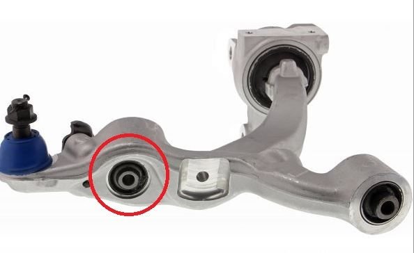 Lift and support the front end so you can use a pry bar to see how much play you can get on that bushing. Also look for little cracks on the rubber between the inner/outer race, you will definitely need a flashlight on the bushing to help see, I also strongly recommend NOT wiping down the bushing initially, pry/look/pry/look, then wipe it down with a rag and pry/look again. You will need to use your best judgement where to line up the prybar to get pressure on that bushing from various angles.