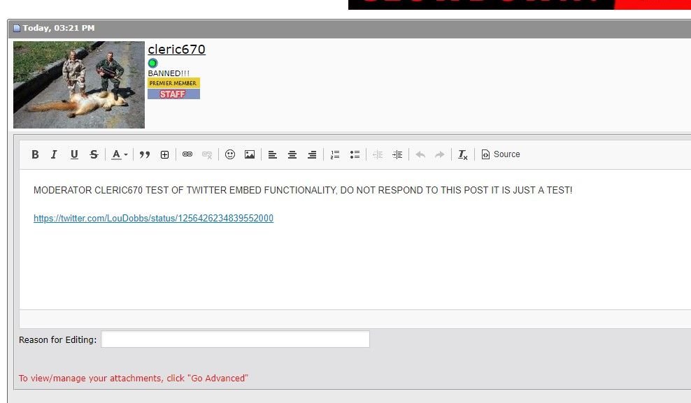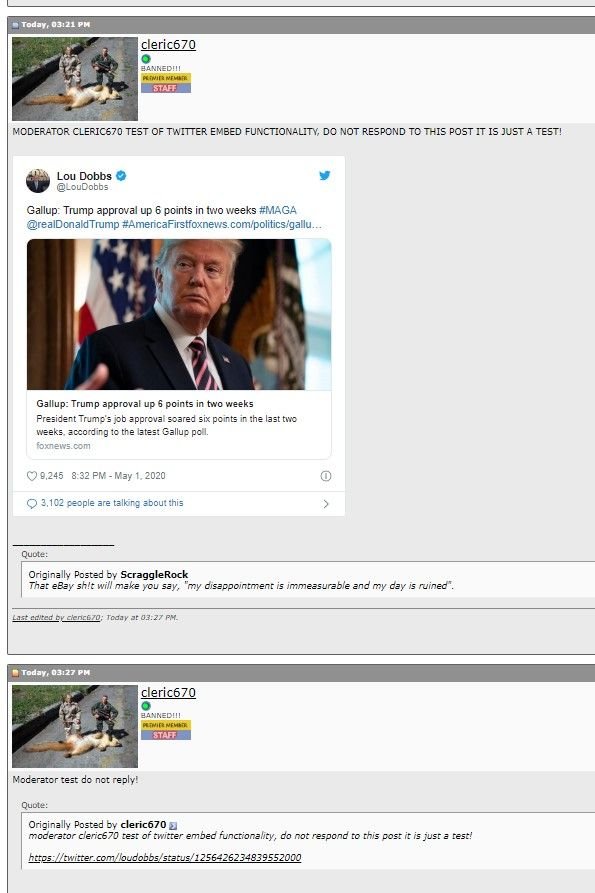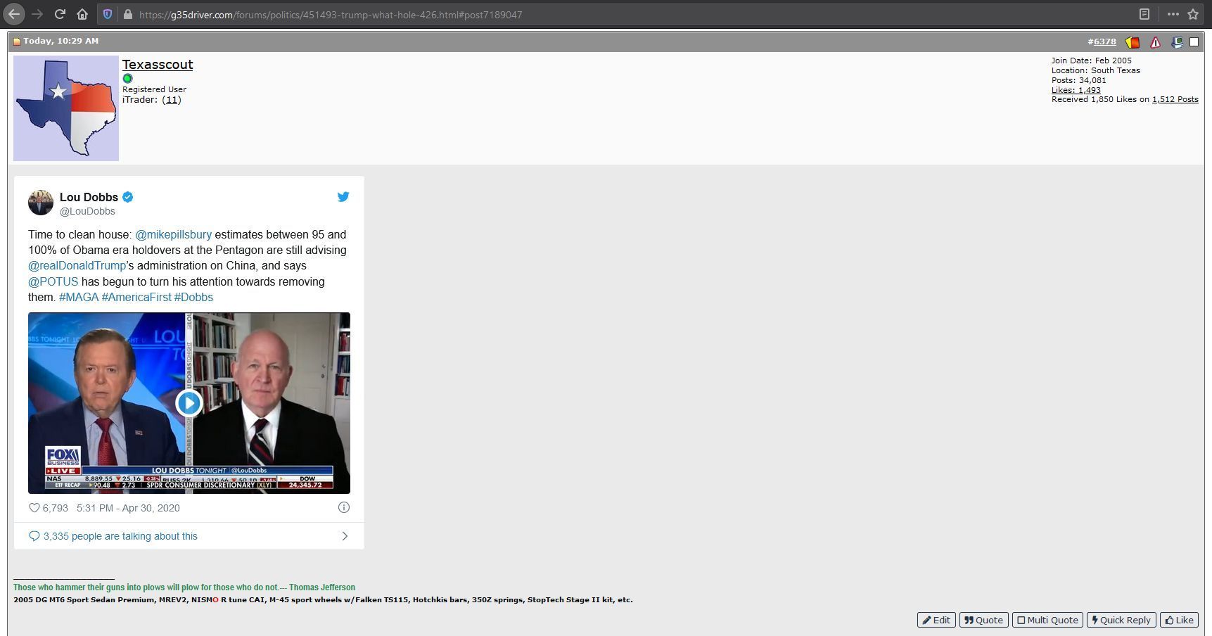 Something of note, I tried multiple other twitter accounts and only the Lou Dobbs twitter failed to embed? Sort of thinking this is a twitter problem and not a G35DRIVER problem.