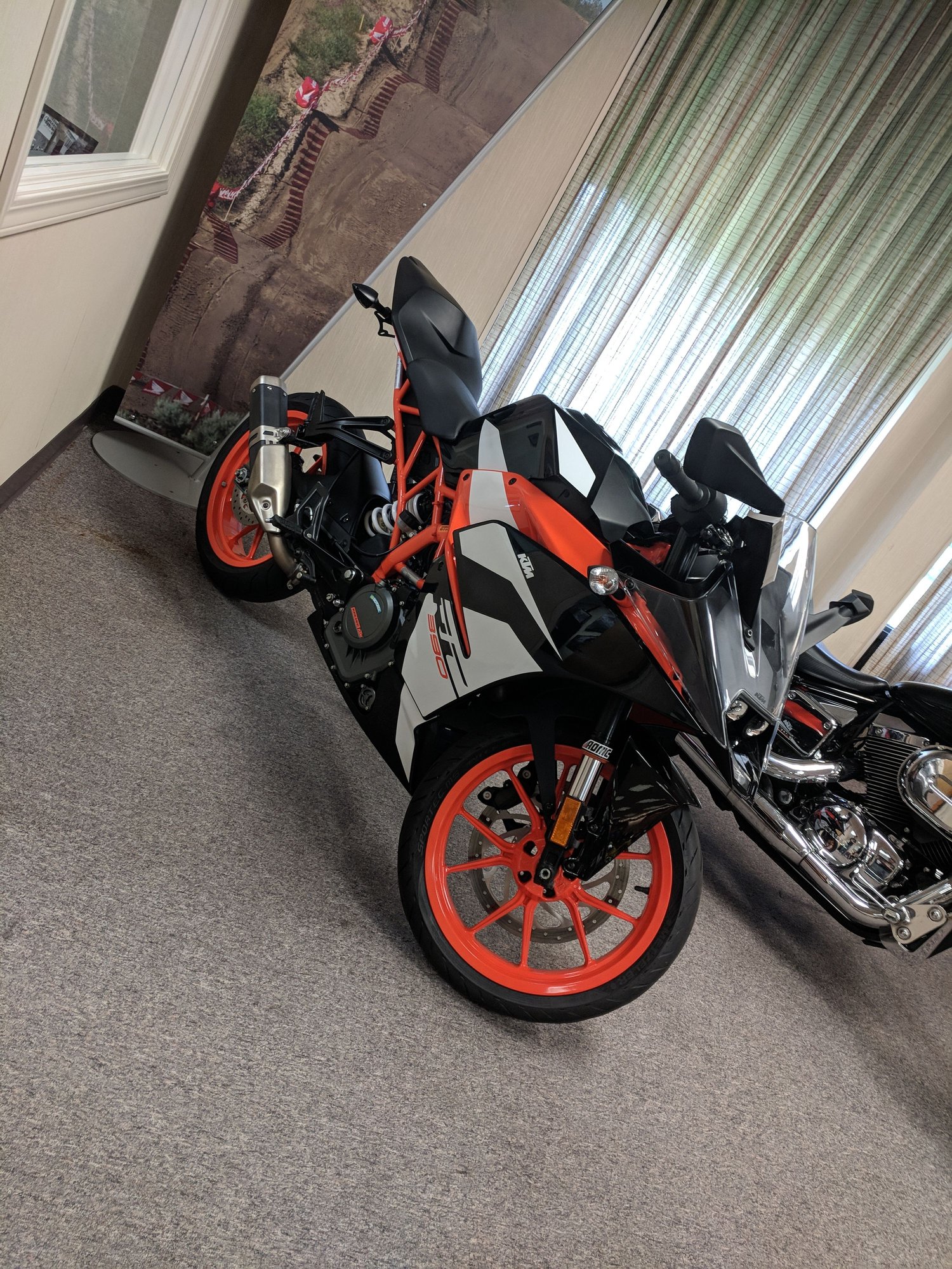 Haven't updated this thread in quite a while, mainly because I haven't been doing anything to the G but driving it. Not sure if I had ever put it in here, but I got my wheels rebuilt (because they had been leaking for the past 1.5 years) and threw on a set of Achilles ATS Sport 2 tires. Anywho, if you go back a few pages you'll see where I was talking about getting a motorcycle, and over the weekend I actually picked one up. I went home to hang out with the parents, and convinced my Dad to go to a dealership with me to "check out their new place," because the dealer had actually just moved. I knew that they had a bike that I was wanting to check out, and it turned out that my dad was friends with the sales manager. We talked numbers, and I put a down payment a few minutes later. I had to head back to Concord so I didn't have a chance to take her home, but she is all mine. 3500 miles, 2017 KTM RC390. I only really have 1 picture of it, because it was such a quick decision, but I got a good deal on it. Bike had been at the dealer for ~6 months, and they had just dropped the price by $400. Super stoked.