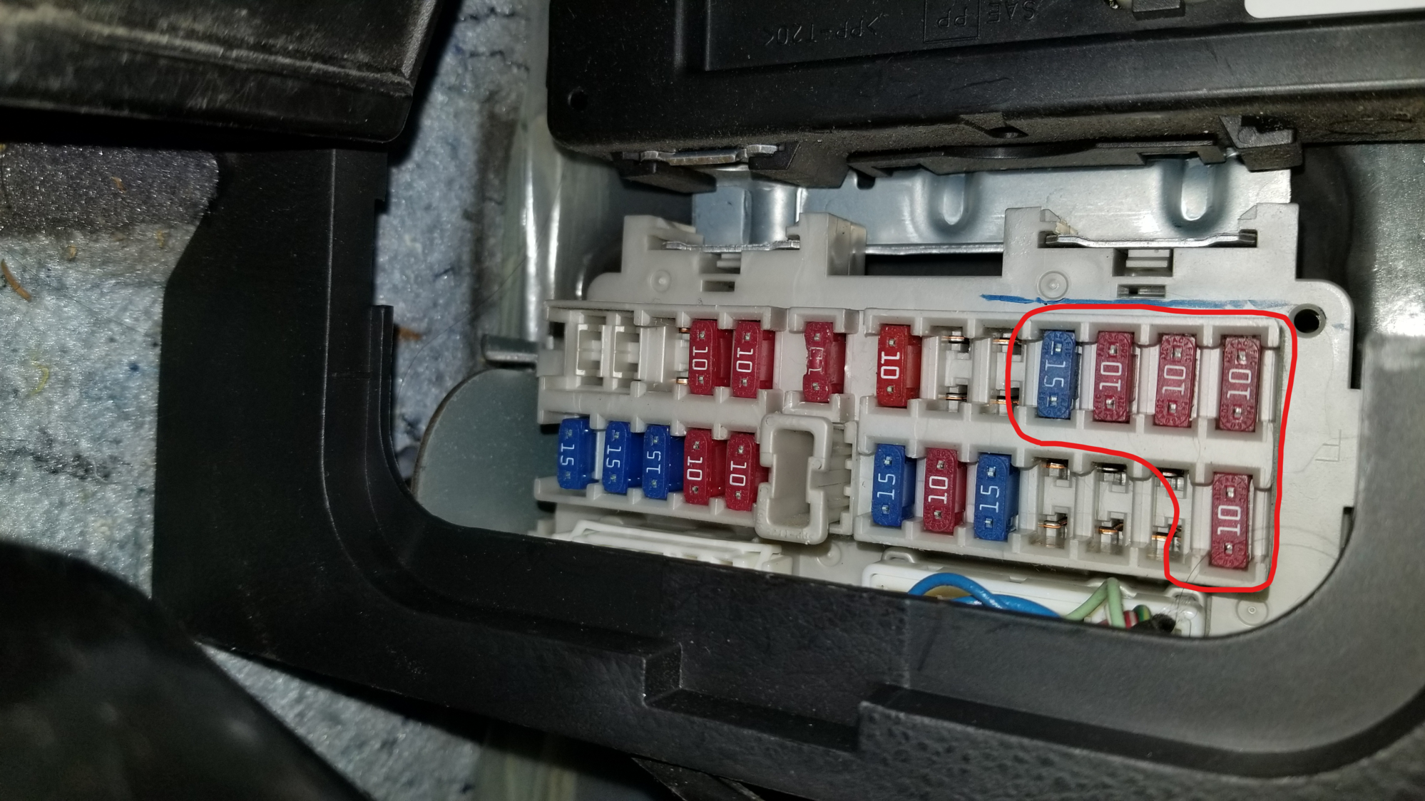 This is my cabin fuse box. The fuses circled in red gave that weird erroneous reading when i tested them with my power probe III, all of the other ones tested ok (including that weird looking one by the fuse puller)