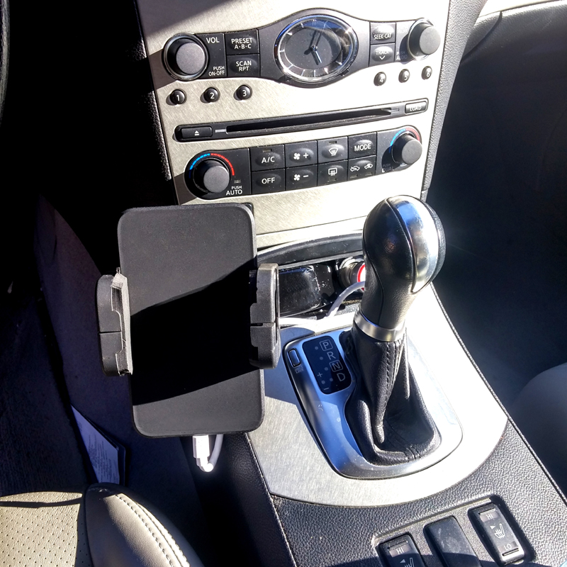 Ok, so I've had my '08 G35 for almost 3 years now and I love it. However, I've always wanted to be able to play music from my phone through the stereo via Bluetooth. While the car does support Bluetooth for voice it won't for music. Plus, I wanted a place to put my phone that wouldn't interfere with wanting to carry a couple bottles of water in the already pathetic cup holder area. I didn't want to use anything that attached to the vents or the CD player as I didn't want to damage anything.