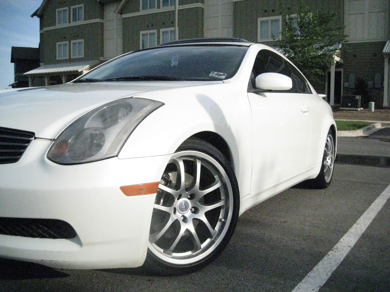 Super clean G35 coupe. Fully loaded with Sports package (6MT, 19'' Alloy Sport wheels, Rear spoiler, Sport suspension). New clutch assembly. New rear Michelin Pilot Sport PS2 tires. CD-quality IPod adapter. BOSE sound system. High-quality dark tint with 2 years left of warranty. Sunroof wind deflector. All scheduled maintenance, Highway miles, Ice cold A/C, Non-smoker, No accidents, Power everything, Runs & drives great, Well maintained.