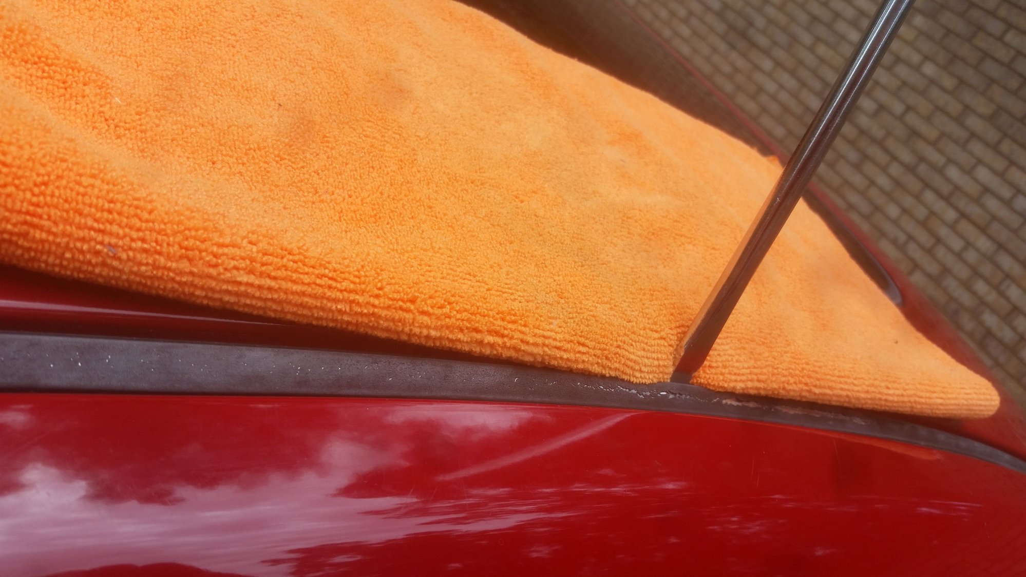 Step 1: remove the rails by pulling it towards you gently with your fingertips, and then slide a flat head screwdriver into the space behind the rail. Take a microfiber cloth and slide it in between the roof and your screwdriver so you dont scratch your paint. Pry up gently with the screwdriver to pop the rail up.