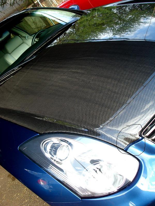 it looks like a real c/f hood. that part you are referring to is the front bumper, the hood not flush so your looking at the front bumper.