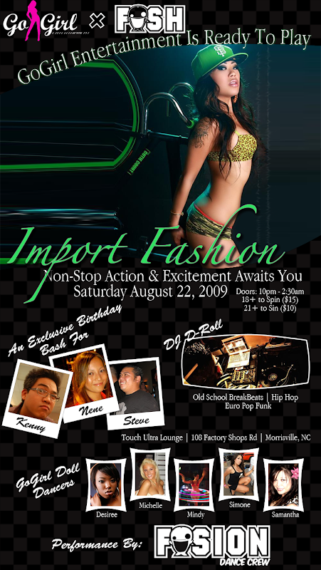 GoGirl Entertainment and FYSH Clothing is proud to present Round II of Import Fashion. After the great success of the first event of its kind in North Carolina we are bringing it back bigger and better than before. The concept of Import Fashion is to bring together an array of designers showcasing their line along with enthusiasts and businesses showing off some of the hottest customized vehicles in the state. Combine the two with an ideal venue along with lights, cameras, gorgeous models, go go dancers and one off DJ’s that will be spinning the tunes all night long. This would undoubtedly be an event that will make its mark. The previous Import Fashion pulled over six hundred people, fourteen vendors and some of the sickest/fastest/mouth watering vehicles around. No event in the Triangle area comes close to the energy, atmosphere and culture that Import Fashion brings to the table.