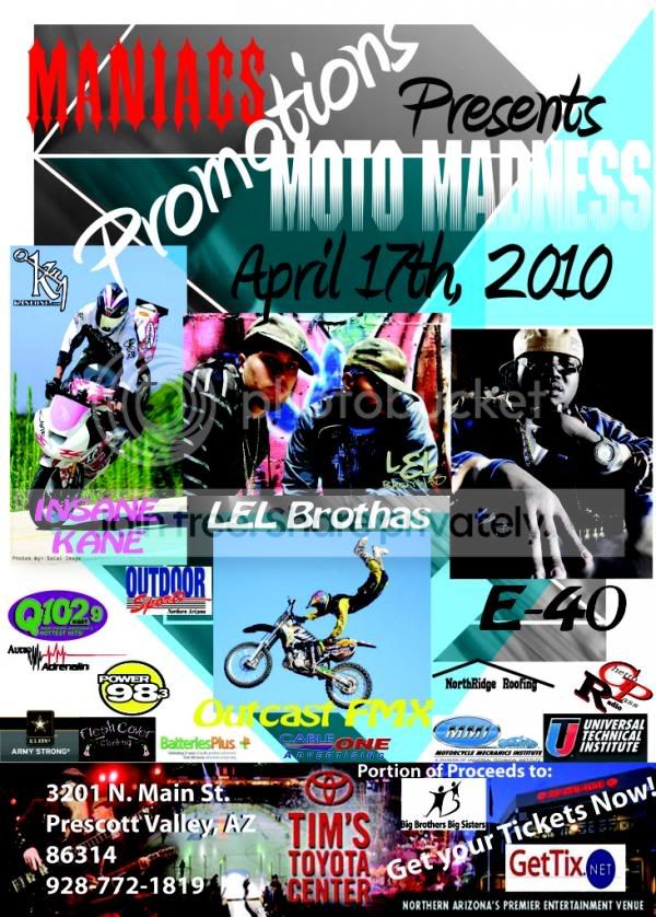 Thats Right April17th 2010 @ Tim's Toyota Center MANIACS Moto Madness is going down in Prescott Valley!!! Door's open at 11AM and don't close till 10PM!!! Act's who have been signed thus far: