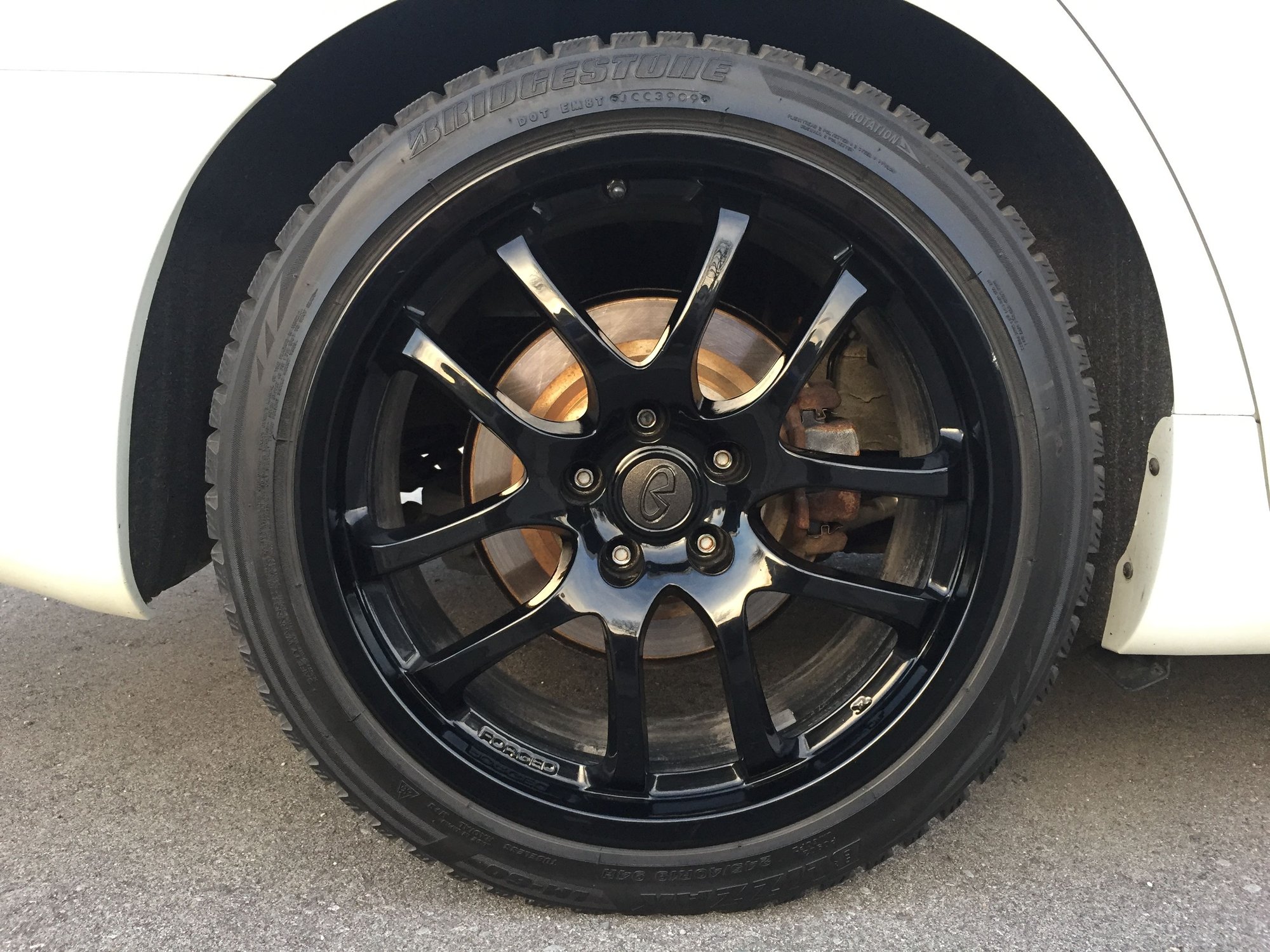 Selling a mint set of 4 Rays Engeneering OEM Infiniti staggered rims. These got powder coated gloss black just last summer and come with Bridgestone Blizzak snow tires which have about 85% tread left.......fronts have just a touch of inside camber wear which can be seen in the pictures. Left rear rim has small curb rash but it's hard to notice. Prefer to sell with tires atleast until I find something to replace them with.