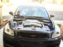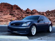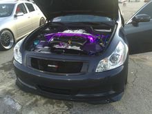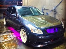 Pics of the G: ken sport lip, Stillen rear duck lip, carbon fiber grill with custom clear coat color match fade, carbon fiber hood with custom clear coat with color match fade, Stillen rear window visor, 19 x 9.5 inch varrsteons powder coated white with low profile tires,varrsteon neo chrome lug nuts, crossed drilled and slotted rotors with ceramic brake pads, custom exhaust, carbon fiber engine cover, carbon fiber gladiator shroud, Nismo oil cap, blitz radiator cap , Cusco strut bar, Stillen dual stage 2 intakes with K&N air filters,nrg steering wheel hub, nrg 10th anniversary carbon fiber quick release, vertex Japan 13 inch embroidered steering wheel with horn button,custom aluminum/rubber pedals, custom swede shift boot, added panel shifters, takata 5 point racing harness, white l.e.d bulbs all around, bride racing custom neck pads, purple led under car, engine at and under seats and dash area,Spc camber and eibach springs, gtr start buttoning, Nismo grill badge, carbon fiber rear diffuser, samco radiator hose set, dual Greddy oil catch cans, password jdm engine dress up bolts, custom painted radiator diversion panel, custom painted battery cover and brake fluid cover, carbon fiber shift knob, Infiniti logo door lights,billion Japan transmission fluid aluminum bottle, led side mirrors, project MU resivuor band, Duralflex front bumper coming soon. Read more ยป