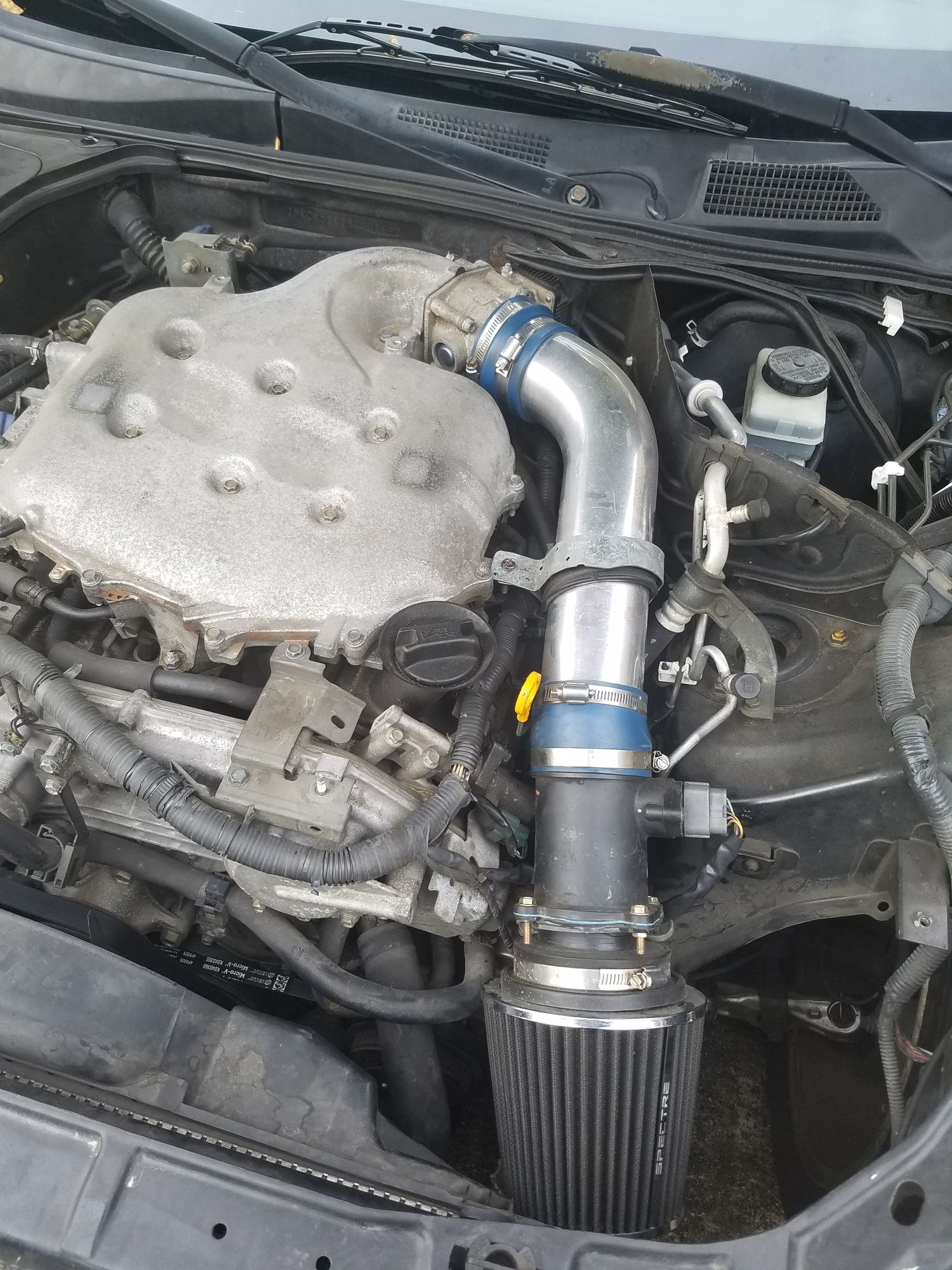 The stock intake was dry rotted when i got it, so i replaced it with a garbage tube i found on ebay. The filter it came with ended up falling apart, so i got this one from autozone. Yes, that is a hurricane strap holding the tube in place. Lots of ghetto work done, but ive done it all myself (with help of some friends).